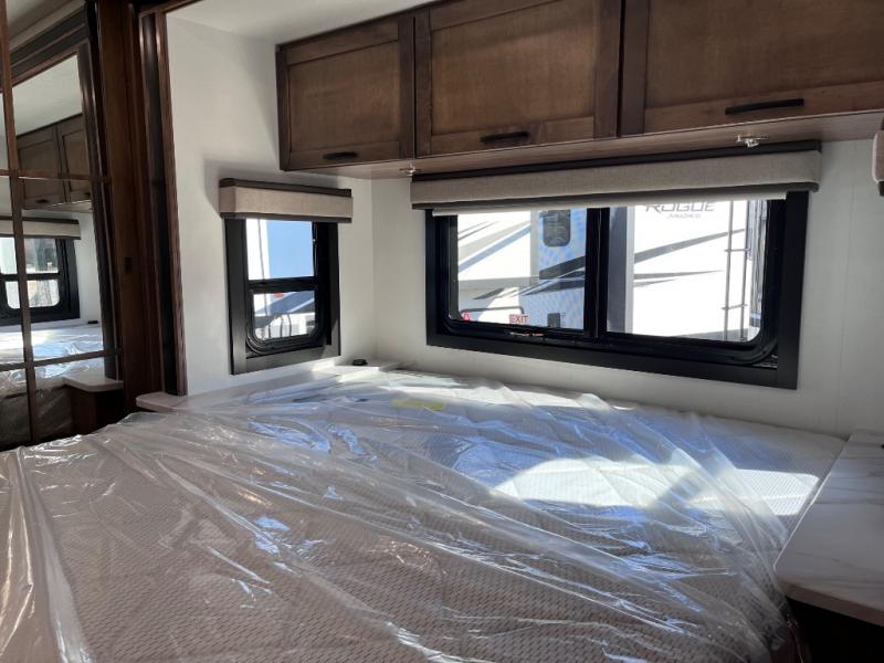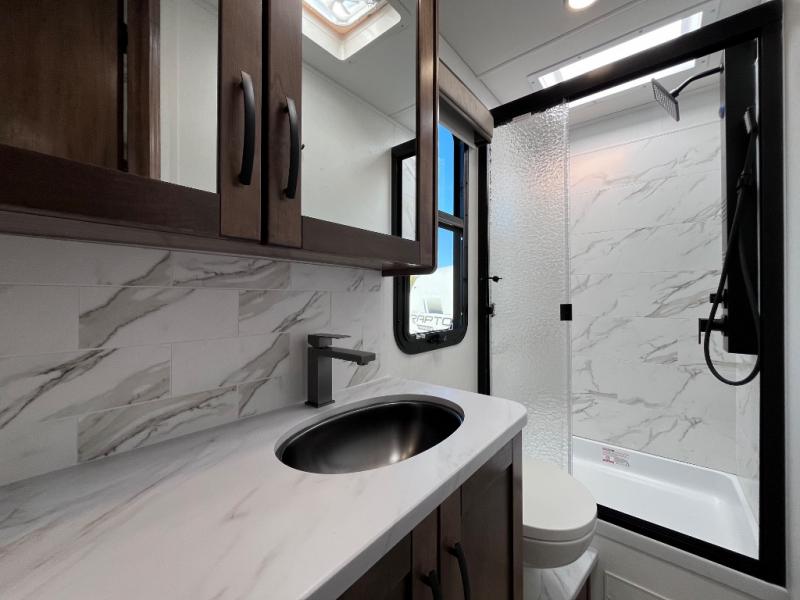 A perfect get-a-way coach for you and your guests with sleeping space for six thanks to the cabover bunk with a 750 lb. capacity and the 68" jack-knife sofa. You could choose the theater seat option in place of the jack-knife sofa if you didn't need the added sleeping space. Each morning and night you will enjoy the 30" x 36" shower with skylight for getting cleaned up. The kitchen will allow you to easily create great meals just like home with a Furrion cooktop and oven, residential microwave, and there is a 10 cu. ft. refrigerator and pantry for food storage. The walk-around king bed will be a welcome retreat at night, and there is a full wardrobe along the back wall for your things. Add an optional TV and you can enjoy late night movies in bed. This unit also allows you to enjoy the outdoors with a 20' awning and outside entertainment center. Note: you can choose a 15 cu. ft. optional refrigerator in place of the 10 cu. ft. if you like.