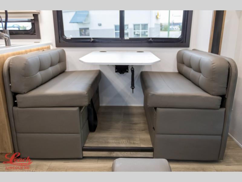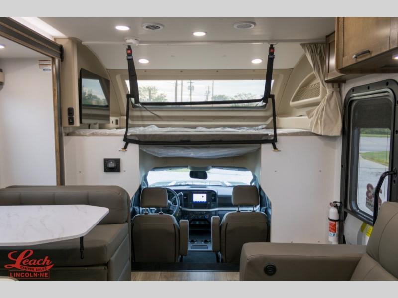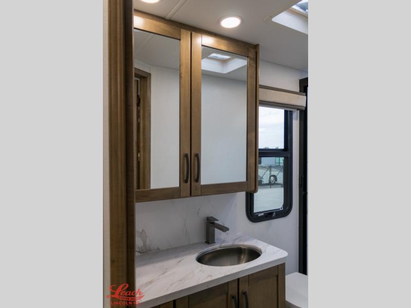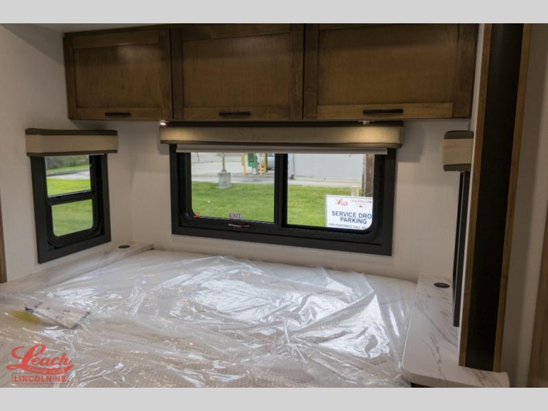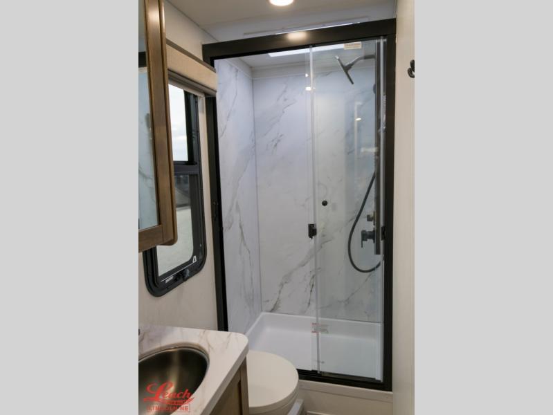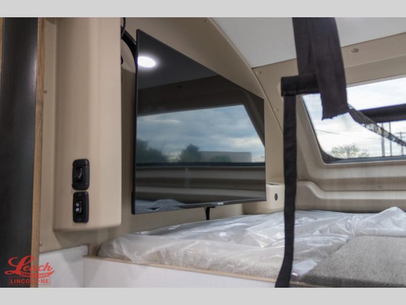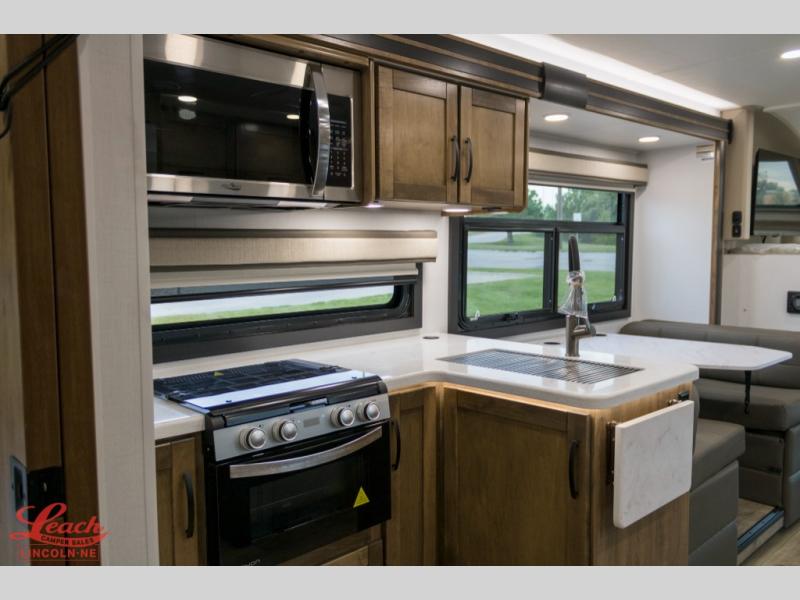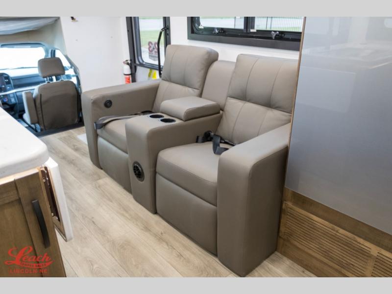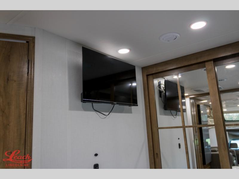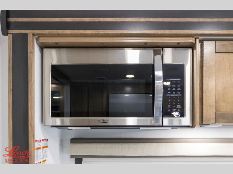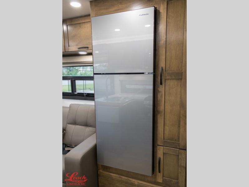 A perfect get-a-way coach for you and your guests with sleeping space for six thanks to the cabover bunk with a 750 lb. capacity and the 68" jack-knife sofa. You could choose the theater seat option in place of the jack-knife sofa if you didn't need the added sleeping space. Each morning and night you will enjoy the 30" x 36" shower with skylight for getting cleaned up. The kitchen will allow you to easily create great meals just like home with a Furrion cooktop and oven, residential microwave, and there is a 10 cu. ft. refrigerator and pantry for food storage. The walk-around king bed will be a welcome retreat at night, and there is a full wardrobe along the back wall for your things. Add an optional TV and you can enjoy late night movies in bed. This unit also allows you to enjoy the outdoors with a 20' awning and outside entertainment center. Note: you can choose a 15 cu. ft. optional refrigerator in place of the 10 cu. ft. if you like.