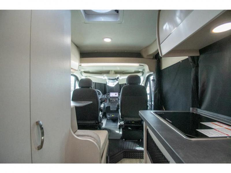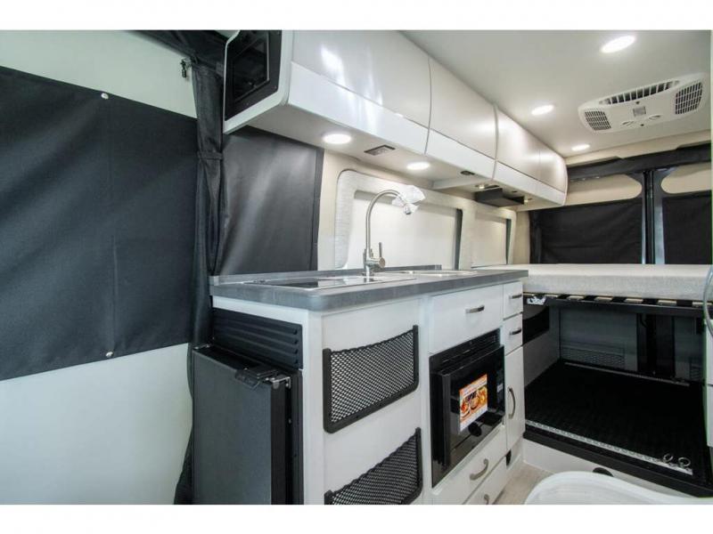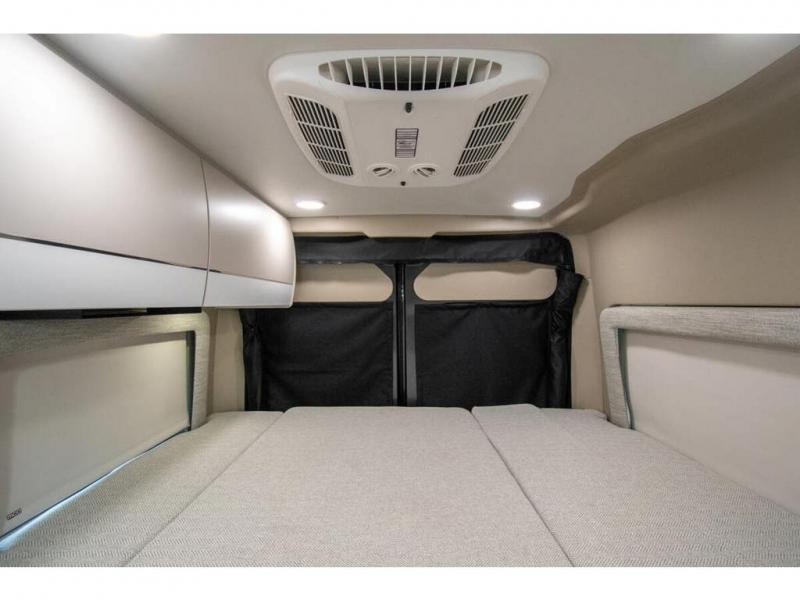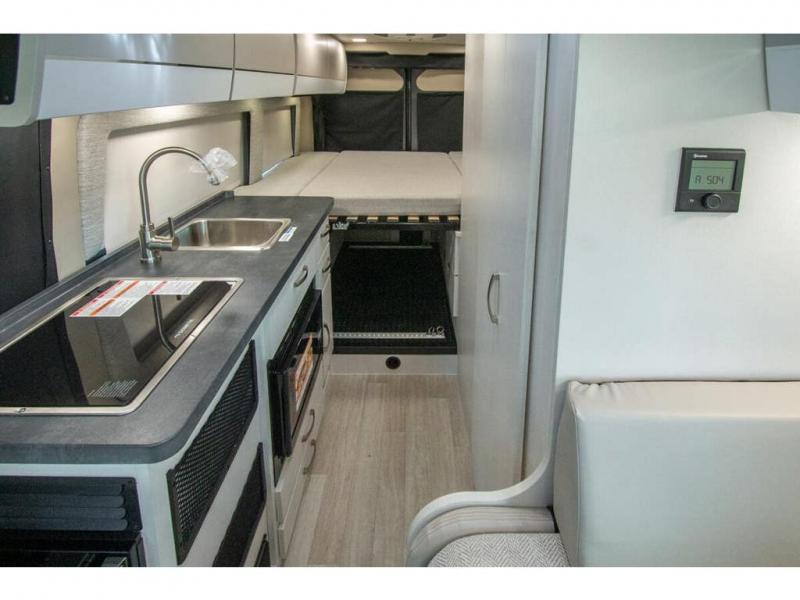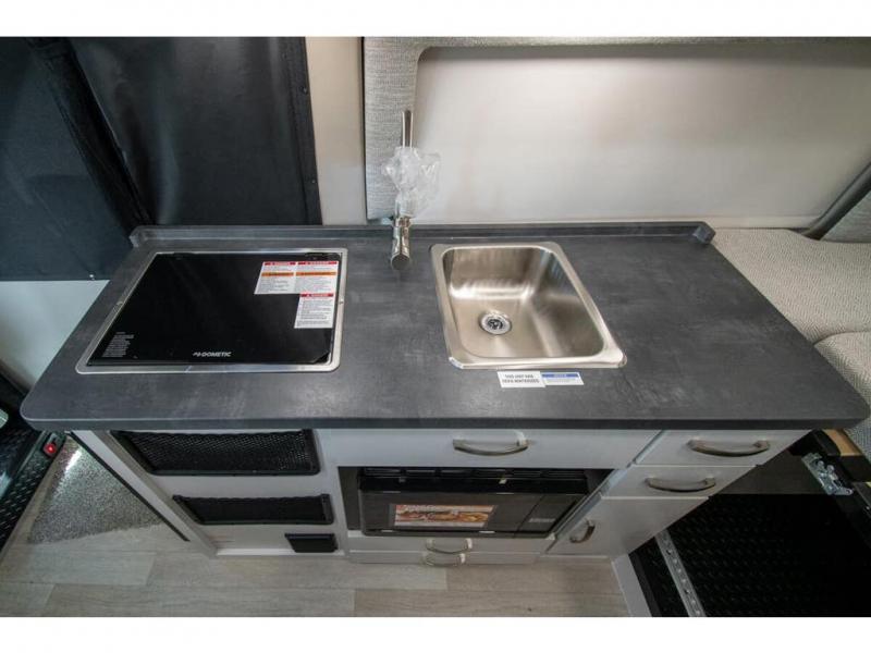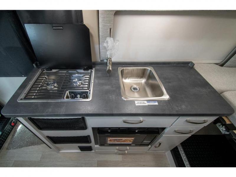 This versatile coach is perfect for two with the option to sleep more when you choose the optional pop top! You can also choose an optional workstation in place of the bench seat up front if you need to get some work done. The wet bath will let you freshen up each day, and the kitchen includes a convection microwave and two burner gas cooktop to cook meals. You'll find a Murphy bed in the back with under-floor storage and pull-out trays, perfect for all your hiking gear! There is also a bench seat as well, along with an overhead cabinet for even more storage.