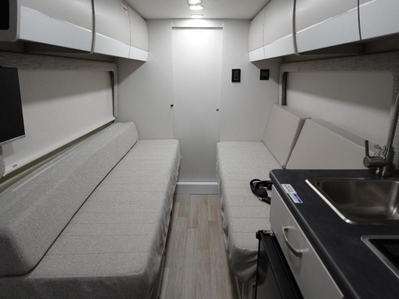 Your trek across country is made comfortable in this coach for two. You can swivel the captains seats around when you get to your destination, or head outdoors to sit under the 13' Thule armless awning with LED lights. The pull-out table indoors will provide a space for your coffee in the morning, while breakfast is being cooked in the convection microwave or on the two burner cooktop. A rear wet bath will allow you to stay clean throughout your trip, and you'll find plenty of storage space for your belongings. You'll love the versatile sleeping arrangements in this model that includes twin-size beds with a filler cushion that converts to a king-size bed, plus there is under-bed storage for your luggage.