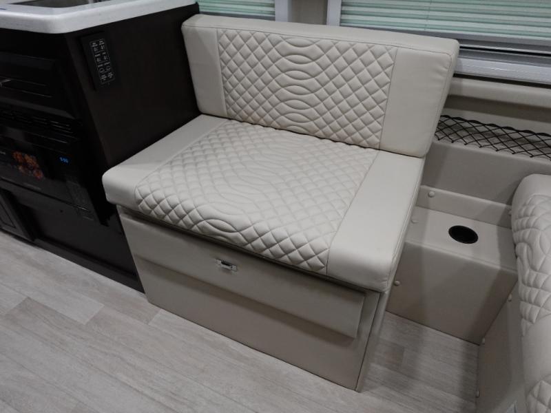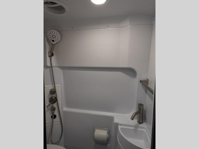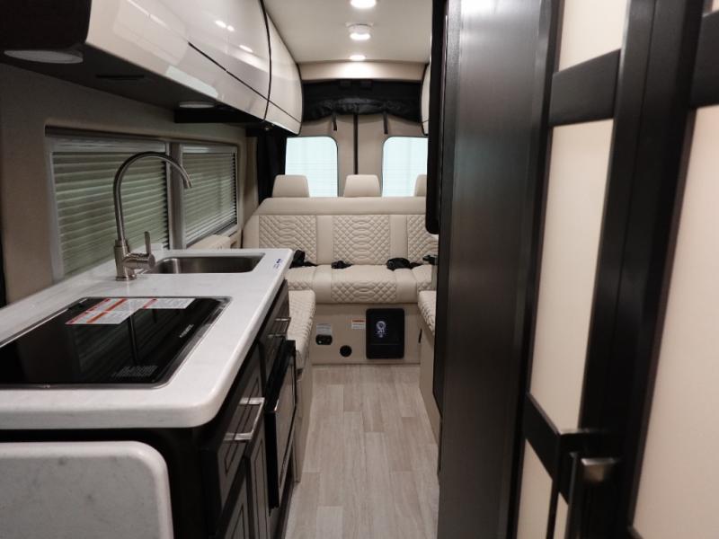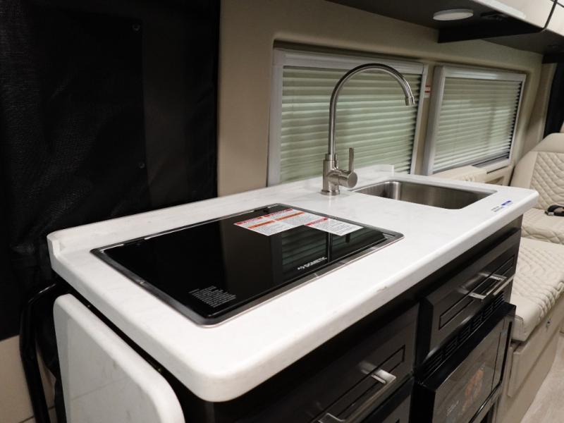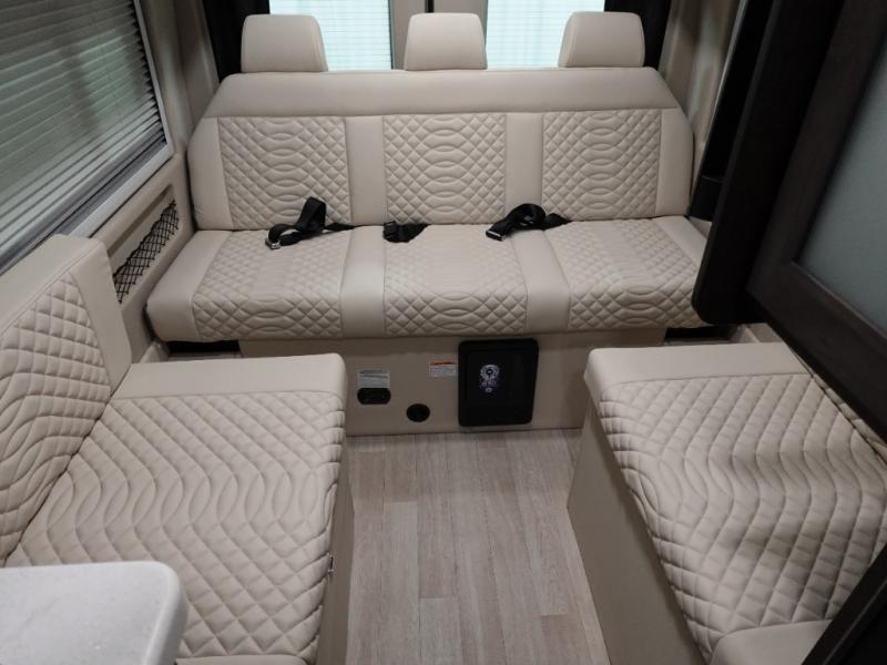 The Expanse brings you luxury, comfort, and safety all in an easy-to-drive Class B size. The rear 68" wide power sofa has plenty of space to stretch out, and two additional jump seats and a table mount make it comfortable enough for a few people to eat dinner or watch the 24" LED HD TV. You could also enjoy meals up front, where the driver and passenger seats can be swiveled around to access the table there. Conveniently, the kitchen is in the middle so no matter where you decide to eat, the table is only a few steps away! The wet bath is also centrally located, with a 25" x 46 3/4" shower, foot flush toilet, and Aqua View® SHOWERMI$ER™ water management system. Thoughtful design includes styling elements like the Tecnoform® European-style high-gloss cabinetry, residential vinyl flooring, and a removable privacy shade for the sliding door window.