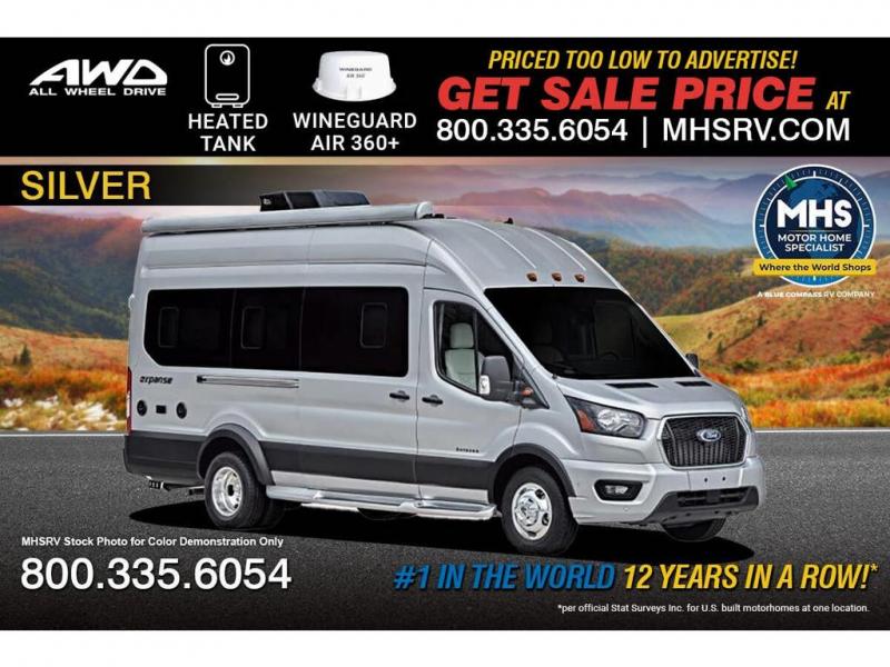 The Expanse brings you luxury, comfort, and safety all in an easy-to-drive Class B size. The rear 68" wide power sofa has plenty of space to stretch out, and two additional jump seats and a table mount make it comfortable enough for a few people to eat dinner or watch the 24" LED HD TV. You could also enjoy meals up front, where the driver and passenger seats can be swiveled around to access the table there. Conveniently, the kitchen is in the middle so no matter where you decide to eat, the table is only a few steps away! The wet bath is also centrally located, with a 25" x 46 3/4" shower, foot flush toilet, and Aqua View® SHOWERMI$ER™ water management system. Thoughtful design includes styling elements like the Tecnoform® European-style high-gloss cabinetry, residential vinyl flooring, and a removable privacy shade for the sliding door window.