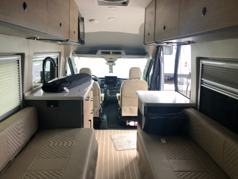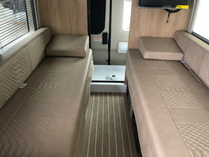 You will love what the 21T floorplan has to offer, there are two twin beds at the rear can be used separately or converted into a roomy sleeping space, giving you a comfortable retreat after a day of exploring. A flip-up seat desk and adjustable table let you create a convenient workspace or dining area, and the driver and passenger seats swivel to join the living space so you can relax. The galley is positioned mid-coach so it’s only a few steps away whether you’re eating up front or lounging on the twin beds. The centrally located wet bath includes a 25" x 47" shower, foot-flush toilet, and Aqua View® SHOWERMI$ER™ water management system to help you conserve water on the road. Thoughtful design finishes it off with soft-close overhead cabinet, residential vinyl flooring, and a removable privacy shade for the sliding door window, creating a clean, modern space that still feels like home.
