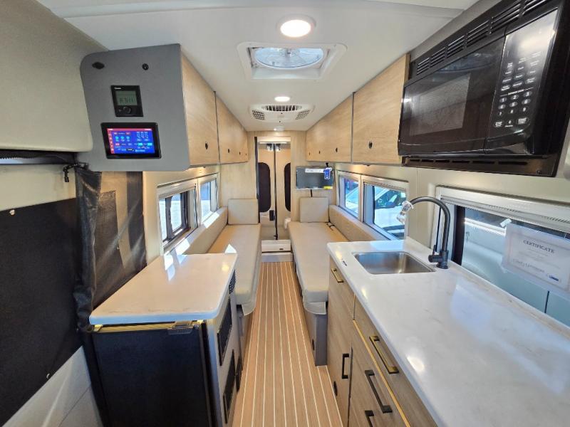 The Entegra Expanse Class B gas motorhome offers the Ford Transit AWD 350HD chassis, so you'll be good to go no matter the terrain or weather. There's a 3.5L EcoBoost V6 engine paired with a 10-speed transmission. You'll also appreciate the utility of all-terrain tires and the heavy-duty trailer tow package with dual 4/7 pin connector. The driving experience is enhanced by cutting-edge safety features like the 360° camera, blind spot assist, and side and reverse sensing systems. Outside amenities include a Carefree® armless motion sensing patio awning, fiberglass running boards, an exterior shower, and both rear and side screen doors. You'll be comfortable no matter what, with the 13,500 BTU air conditioner. An 2800W generator and 200W roof-mounted GoPower® solar panel with integrated control panel both come standard for all your power needs.