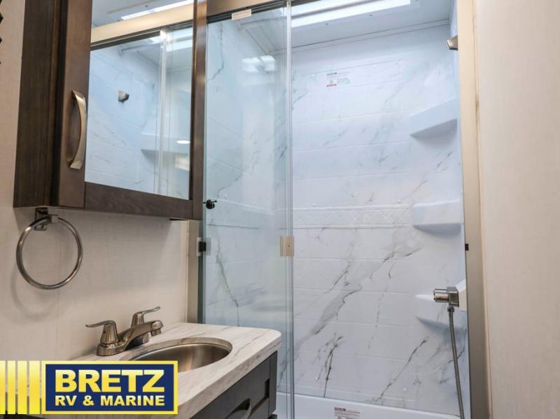 Looking to travel to see family and friends while stopping along the way to take in the scenery? Need comfortable accommodations for you and another plus extra sleeping space when you have overnight guests? This coach provides a full-wall slide for more interior floor space and includes a queen bed for a good night's sleep, a wardrobe for clothing, plus a U-shaped dinette and pantry. The dinette doubles as sleeping space, plus you have a cab-over bunk. The cook will have everything nearby to whip up meals including a residential-size microwave, and the full bathroom allows everyone to skip the public facilities along the way.