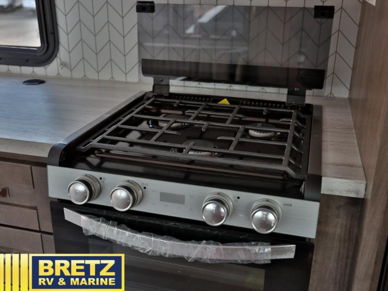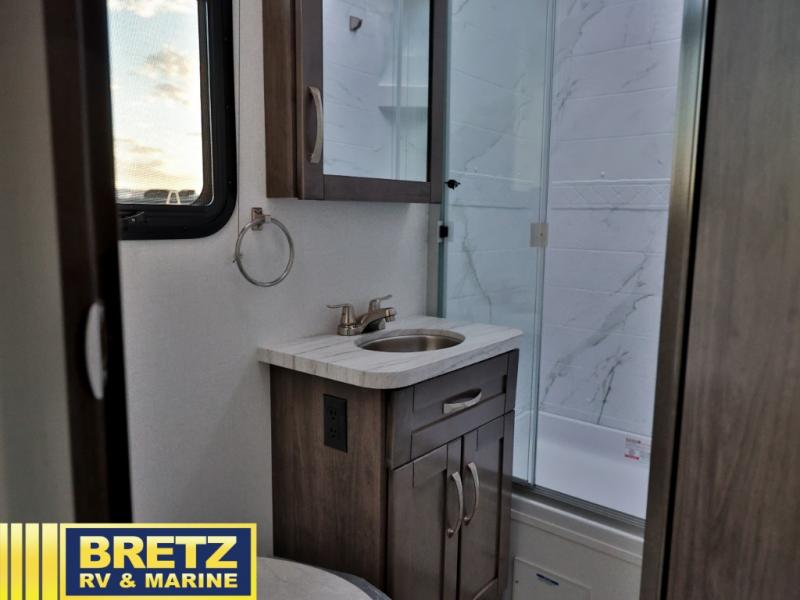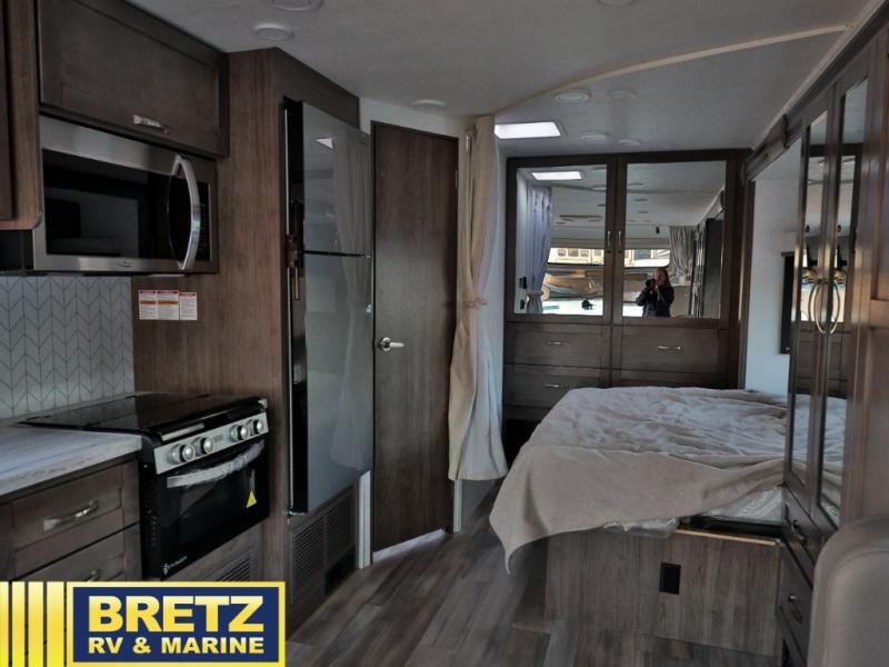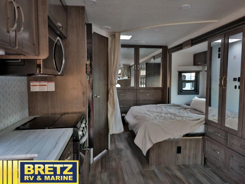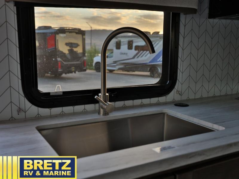With any Odyssey Class C gas motorhome by Entegra Coach, the driver will appreciate the power from the 325 HP engine, the towing capacity from the 7,500 lb. hitch, the tire pressure monitoring system, the navigation from the Sony infotainment center with Apple CarPlay and Android Auto, plus the backup and side-view cameras when parking and driving down the highway. The kitchen offers full amenities including a recessed stainless steel sink with a cutting board sink cover, LED-lit countertops, a decorative backsplash, and a pop-up charging station with 110 outlet and USB plugs to keep your smart phones charged. Get ready for luxury in a Class C, choose your favorite today!