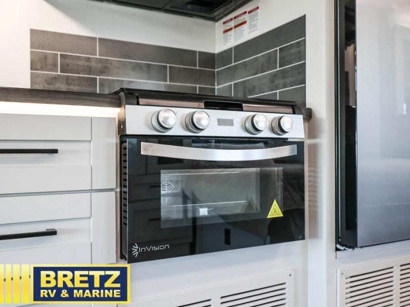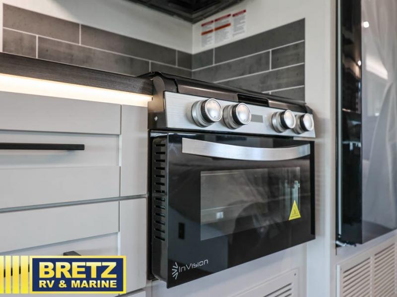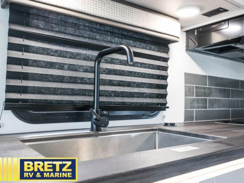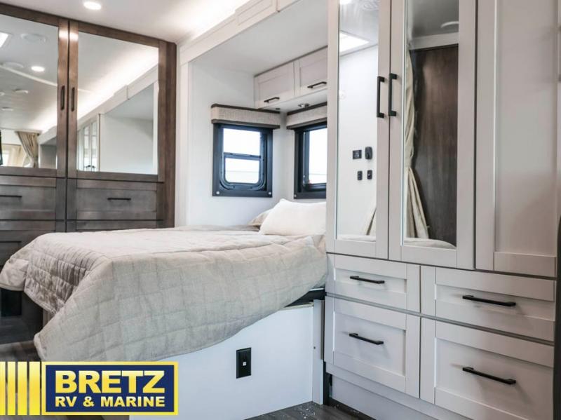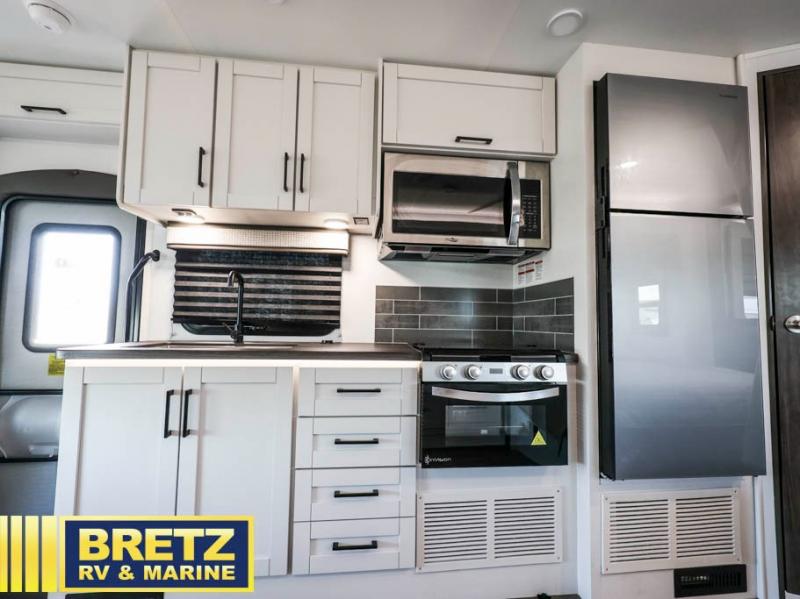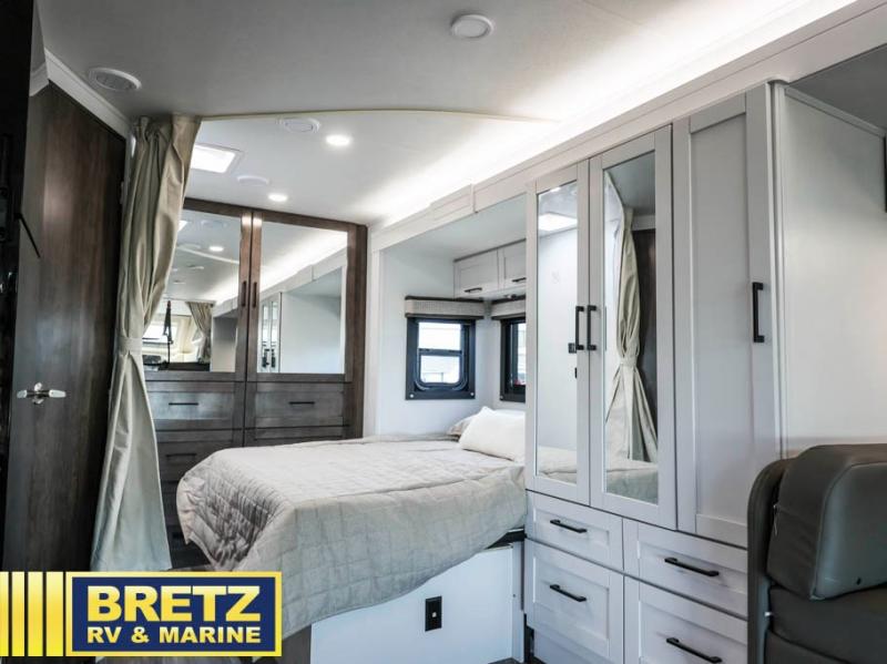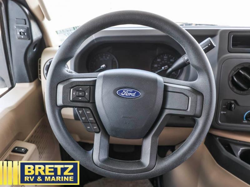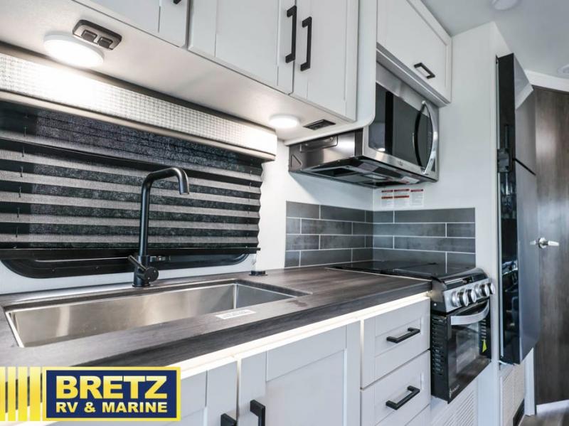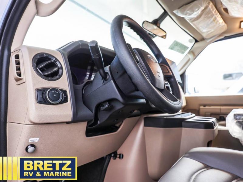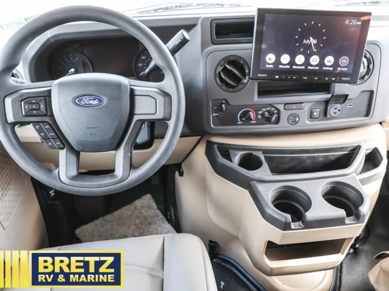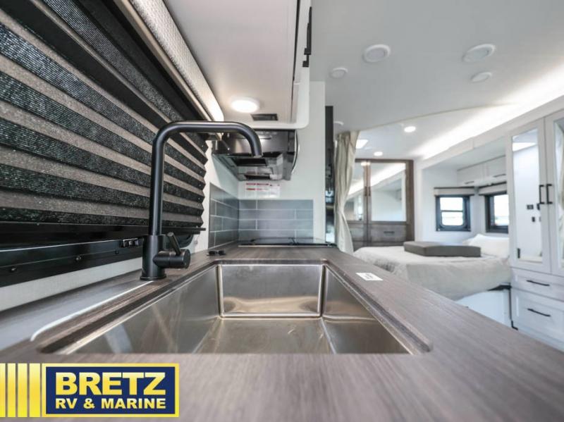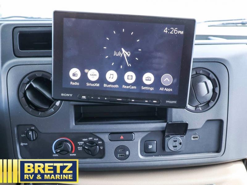 With any Odyssey Class C gas motorhome by Entegra Coach, the driver will appreciate the power from the 325 HP engine, the towing capacity from the 7,500 lb. hitch, the tire pressure monitoring system, the navigation from the Sony infotainment center with Apple CarPlay and Android Auto, plus the backup and side-view cameras when parking and driving down the highway. The kitchen offers full amenities including a recessed stainless steel sink with a cutting board sink cover, LED-lit countertops, a decorative backsplash, and a pop-up charging station with 110 outlet and USB plugs to keep your smart phones charged. Get ready for luxury in a Class C, choose your favorite today!