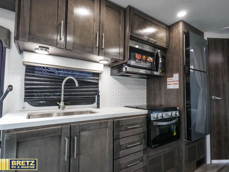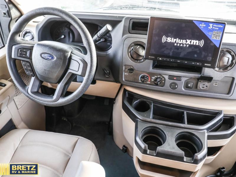 With any Odyssey Class C gas motorhome by Entegra Coach, the driver will appreciate the power from the 325 HP engine, the towing capacity from the 7,500 lb. hitch, the tire pressure monitoring system, the navigation from the Sony infotainment center with Apple CarPlay and Android Auto, plus the backup and side-view cameras when parking and driving down the highway. The kitchen offers full amenities including a recessed stainless steel sink with a cutting board sink cover, LED-lit countertops, a decorative backsplash, and a pop-up charging station with 110 outlet and USB plugs to keep your smart phones charged. Get ready for luxury in a Class C, choose your favorite today!