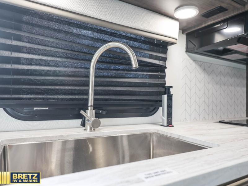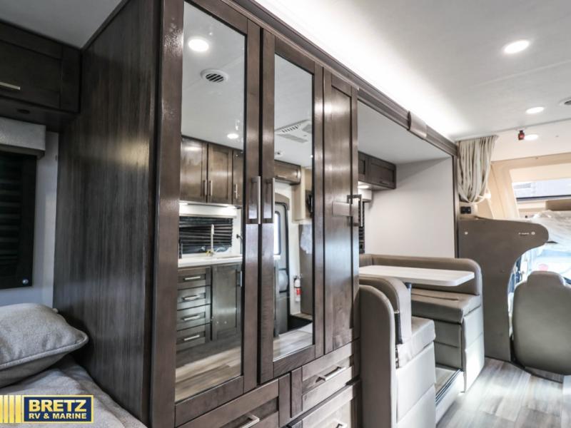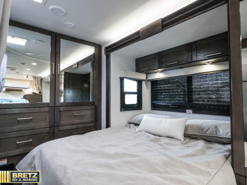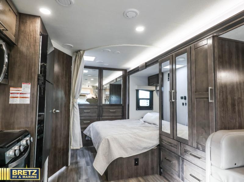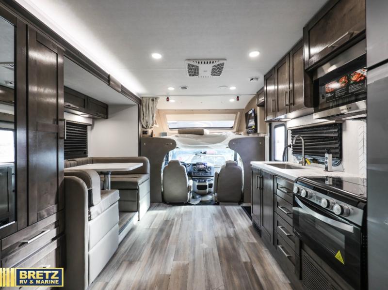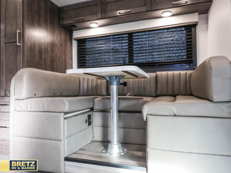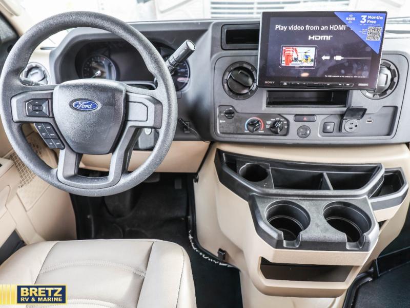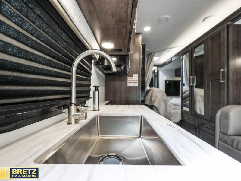 With any Odyssey Class C gas motorhome by Entegra Coach, the driver will appreciate the power from the 325 HP engine, the towing capacity from the 7,500 lb. hitch, the tire pressure monitoring system, the navigation from the Sony infotainment center with Apple CarPlay and Android Auto, plus the backup and side-view cameras when parking and driving down the highway. The kitchen offers full amenities including a recessed stainless steel sink with a cutting board sink cover, LED-lit countertops, a decorative backsplash, and a pop-up charging station with 110 outlet and USB plugs to keep your smart phones charged. Get ready for luxury in a Class C, choose your favorite today!