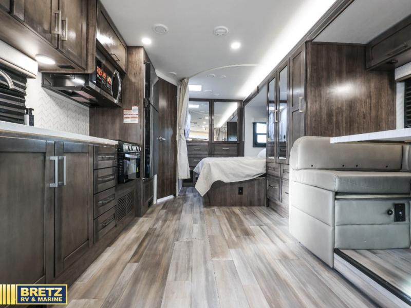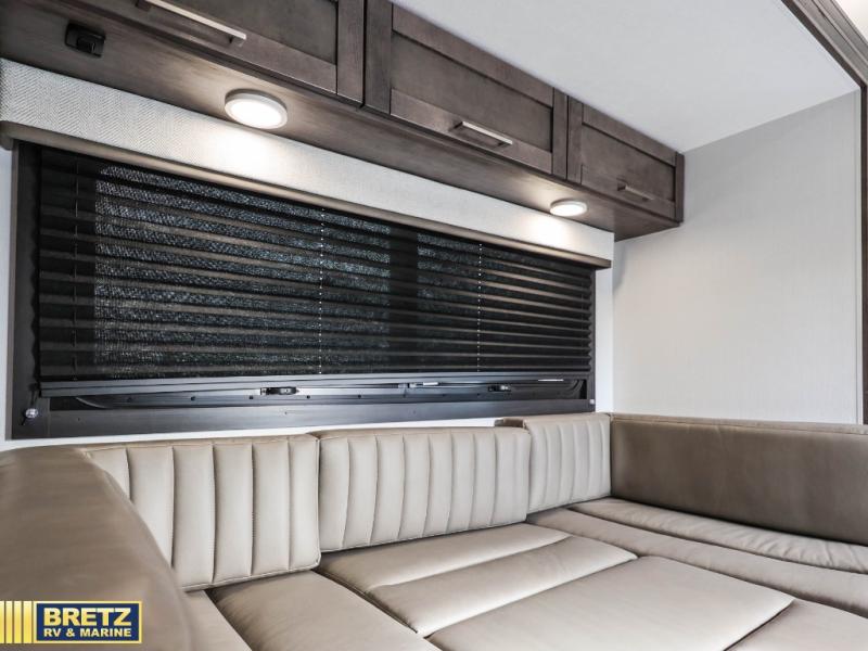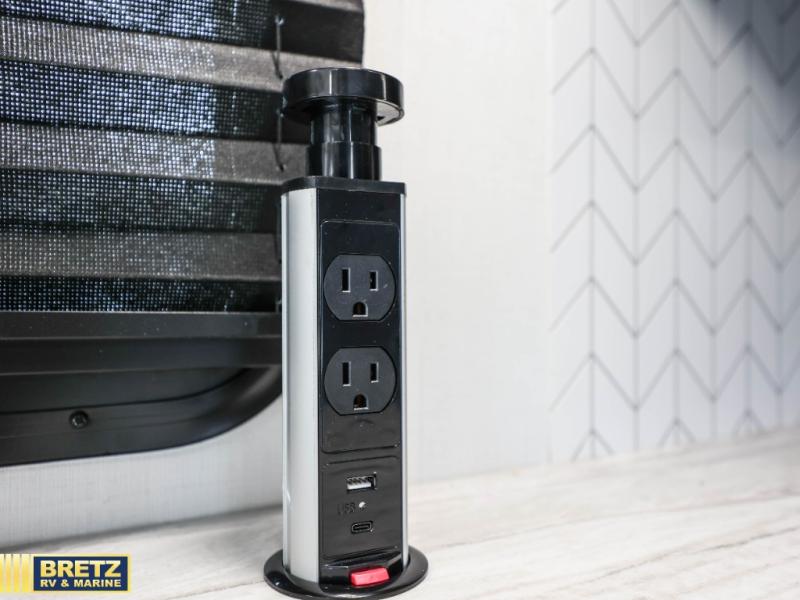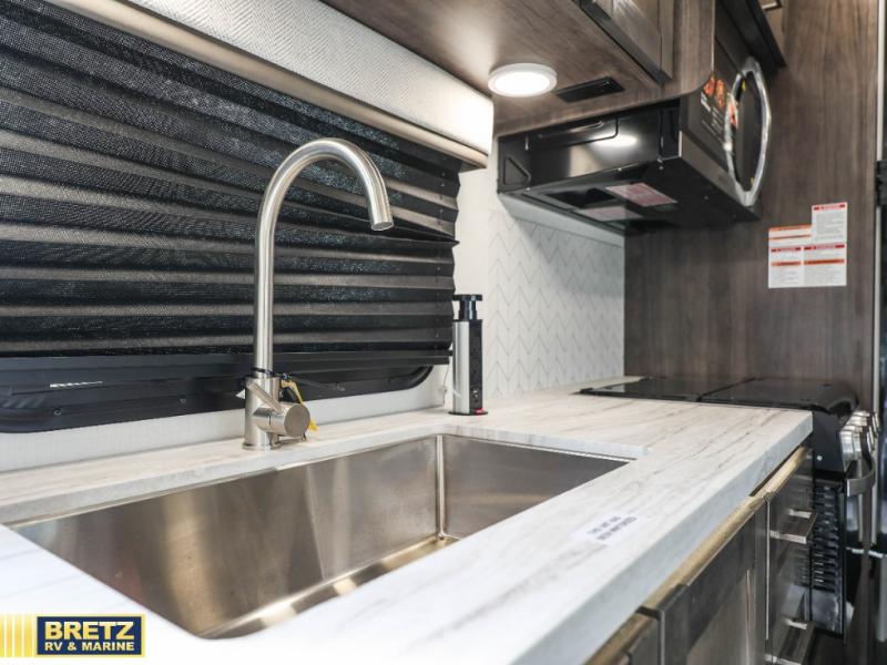 With any Odyssey Class C gas motorhome by Entegra Coach, the driver will appreciate the power from the 325 HP engine, the towing capacity from the 7,500 lb. hitch, the tire pressure monitoring system, the navigation from the Sony infotainment center with Apple CarPlay and Android Auto, plus the backup and side-view cameras when parking and driving down the highway. The kitchen offers full amenities including a recessed stainless steel sink with a cutting board sink cover, LED-lit countertops, a decorative backsplash, and a pop-up charging station with 110 outlet and USB plugs to keep your smart phones charged. Get ready for luxury in a Class C, choose your favorite today!