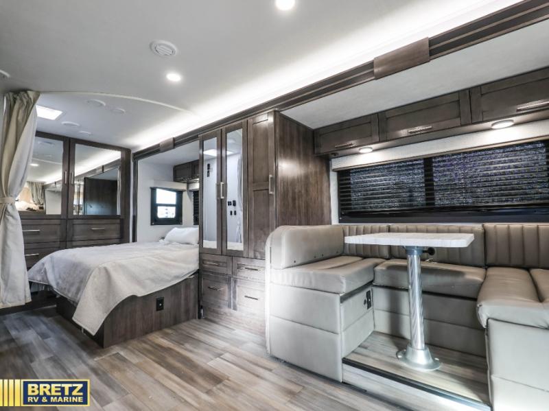 Looking to travel to see family and friends while stopping along the way to take in the scenery? Need comfortable accommodations for you and another plus extra sleeping space when you have overnight guests? This coach provides a full-wall slide for more interior floor space and includes a queen bed for a good night's sleep, a wardrobe for clothing, plus a U-shaped dinette and pantry. The dinette doubles as sleeping space, plus you have a cab-over bunk. The cook will have everything nearby to whip up meals including a residential-size microwave, and the full bathroom allows everyone to skip the public facilities along the way.