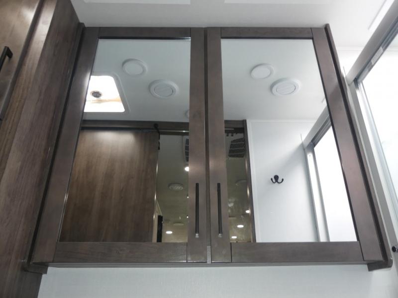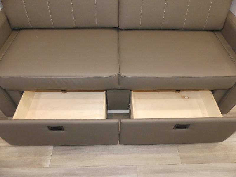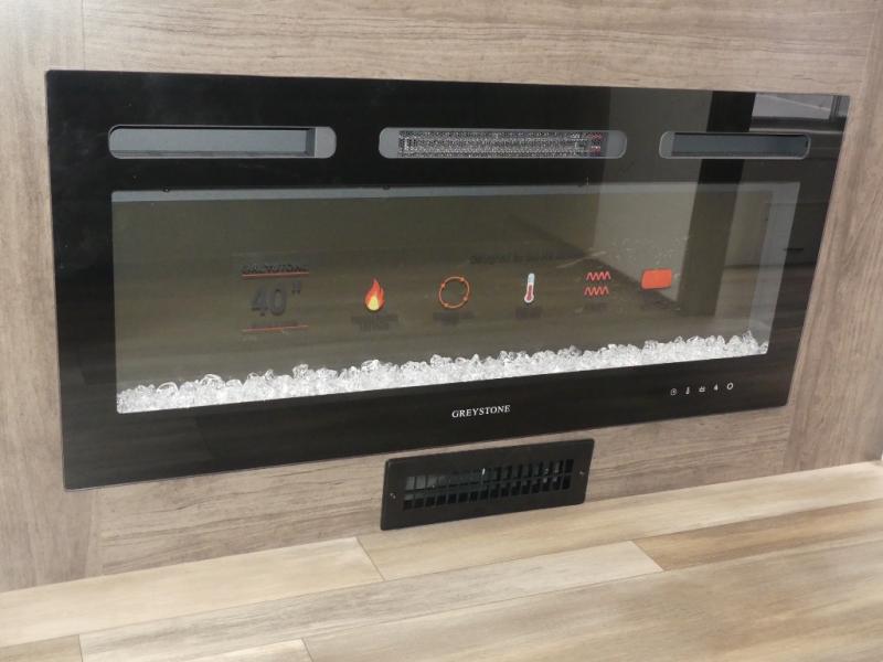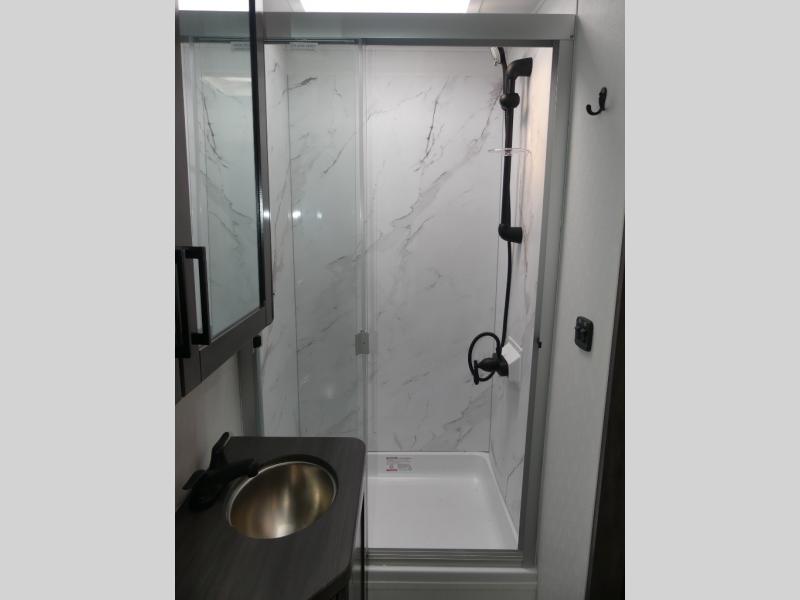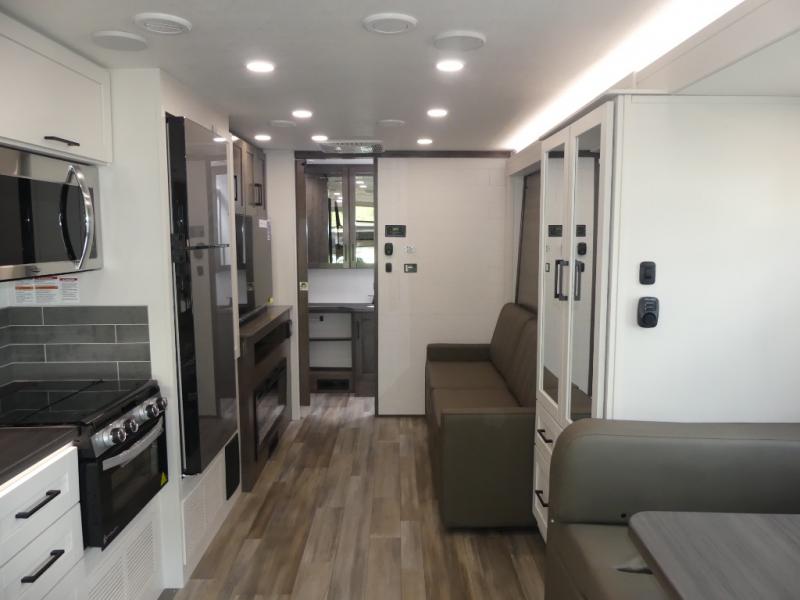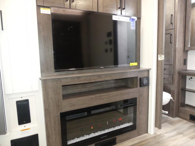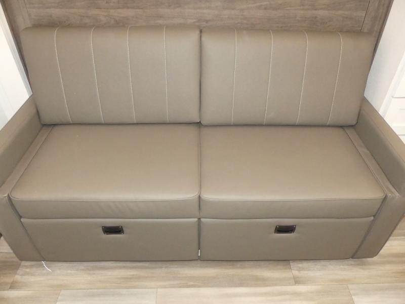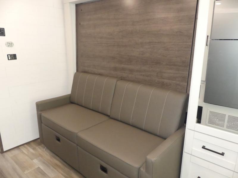 Enjoy a whole lot of comfort, fun and versatility in this coach! The queen Murphy bed and sofa combination allows you to convert between a living area and a bedroom, with a fireplace and an LED HD Smart TV. Outside, the exterior TV and 19' electric awning provide you an outdoor living space to enjoy nature and its beauty. The inside also provides a rear full bathroom including a space saving sliding door, linen storage, counter space for toiletries and a shower. You can dine at the U-shaped dinette or while sitting on the swivel captains chairs, and the cab-over bunk will be a perfect place to stay the night.