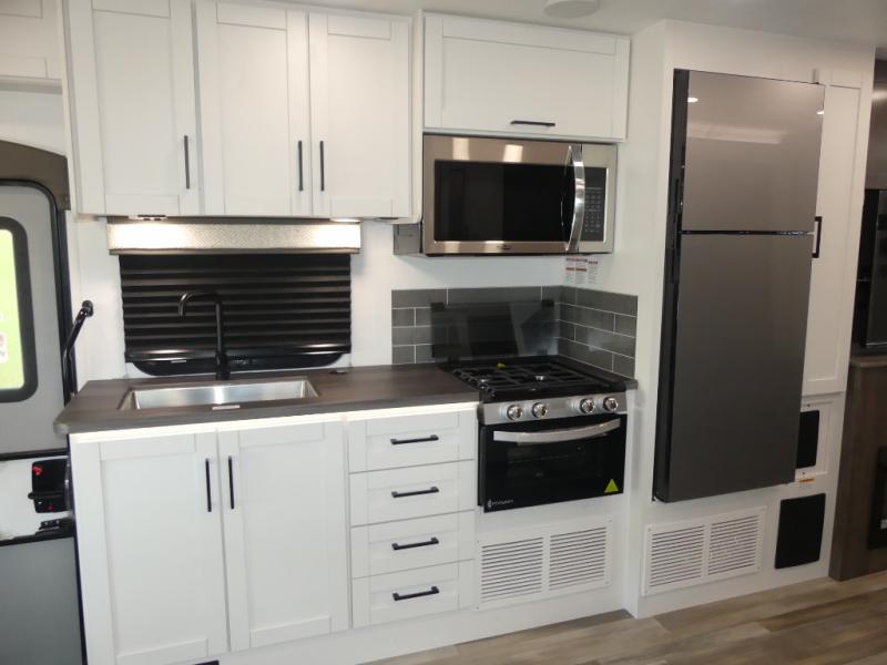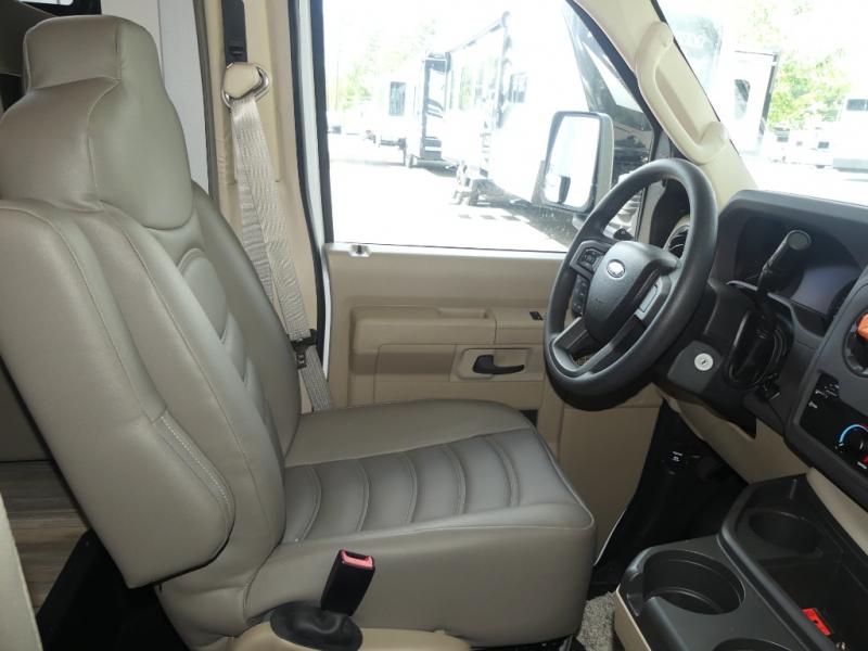With any Odyssey Class C gas motorhome by Entegra Coach, the driver will appreciate the power from the 325 HP engine, the towing capacity from the 7,500 lb. hitch, the tire pressure monitoring system, the navigation from the Sony infotainment center with Apple CarPlay and Android Auto, plus the backup and side-view cameras when parking and driving down the highway. The kitchen offers full amenities including a recessed stainless steel sink with a cutting board sink cover, LED-lit pressed countertops, a decorative backsplash, and a pop-up charging station with 110 outlet and USB plugs to keep your smart phones charged. Get ready for luxury in a Class C, choose your favorite today!