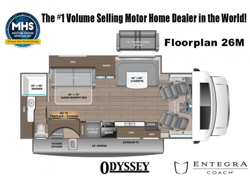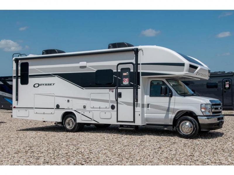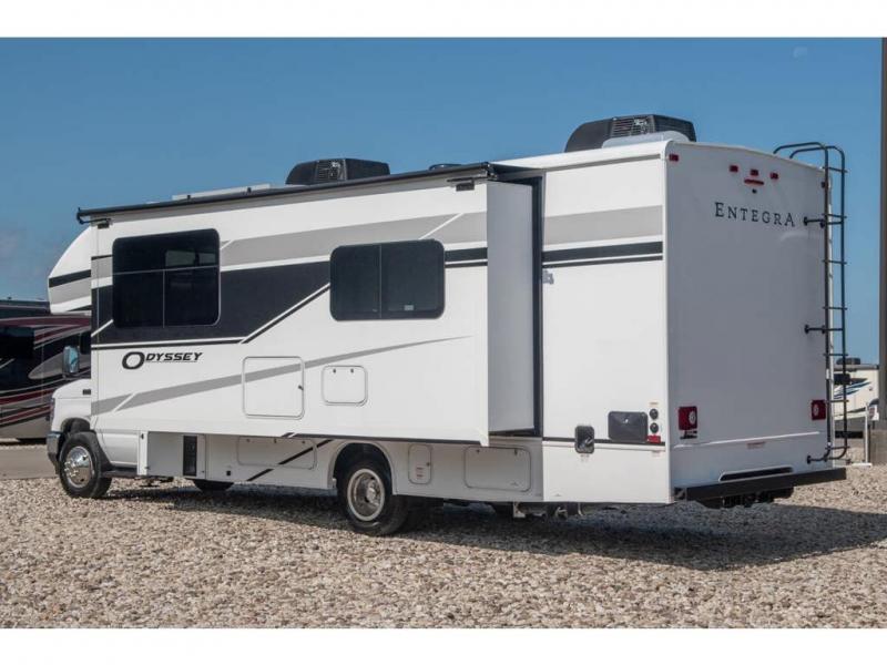 MSRP $181,795. New 2026 Entegra Odyssey 26M Luxury Class C RV. The Odyssey features a one-piece seamless fiberglass roof, front and rear stabilizer bars, Hellwig Helper springs, and the all-new Ford® V8 and E-450 chassis. You will also love the Entegra Coach Odyssey's amazing molded front fiberglass cap that distinguishes this class C from any other on the market today. The distinctive design also enables the front cab-over to feature a huge built-in skylight with power shade. Just push a button and let Mother Nature light up the beautiful interior décor and gaze at the stars at the end of a fun-filled day. Options include the customer value package, dual A/C's, solar panel, automatic hydraulic leveling jacks and sun folding windshield shade. Shop hundreds of class C gas RVs at 1 location! Choose from Fleetwood Altitude - Gulf Stream BT Cruiser - Thor Chateau - Four Winds - Geneva and Quantum - Entegra Coach Odyssey Odyssey SE and Esteem - East to West Entrada - Forest River Forester - Forester LE - Nexus Phantom - Viper and much more. We also sell quality pre-owned models such as Jayco Greyhawk – Redhawk - Redhawk SE - Thor Magnitude - Winnebago Spirit - and Minnie Winnie - Coachmen Freelander and Leprechaun - Forest River Sunseeker Classic - Sunseeker LE – Solera - Holiday Rambler Incline and much more. Visit MHSRV.com for our complete line-up and the sale prices that have made us the #1 volume selling motor home dealership in the world 12 years in a row! For additional details on this unit and our entire inventory including brochures, window sticker, videos, photos, reviews & testimonials as well as additional information about Motor Home Specialist and our manufacturers please visit us at MHSRV.com or call 800-335-6054. At Motor Home Specialist, we DO NOT charge any prep or orientation fees like you will find at other dealerships. All sale prices include a 200-point inspection, interior & exterior wash, detail service and a fully automated high-pressure rain booth test and coach wash that is a standout service unlike that of any other in the industry. You will also receive a thorough coach orientation with an MHSRV technician, a night stay in our delivery park featuring landscaped and covered pads with full hook-ups and much more! Read Thousands upon Thousands of 5-Star Reviews at MHSRV.com and See What They Had to Say About Their Experience at Motor Home Specialist. WHY PAY MORE? WHY SETTLE FOR LESS?