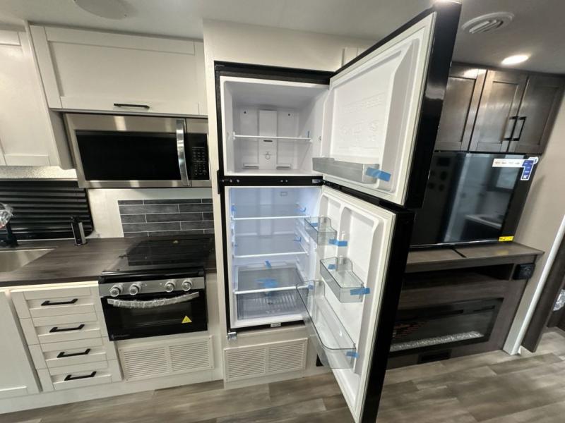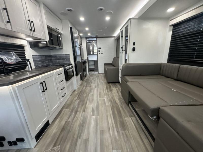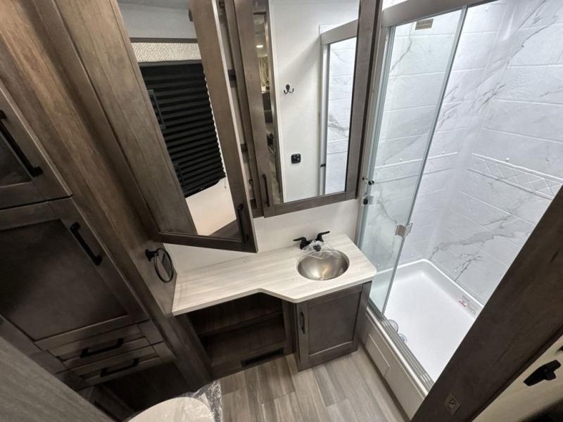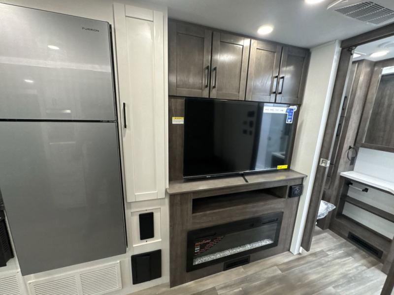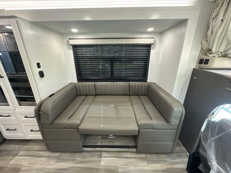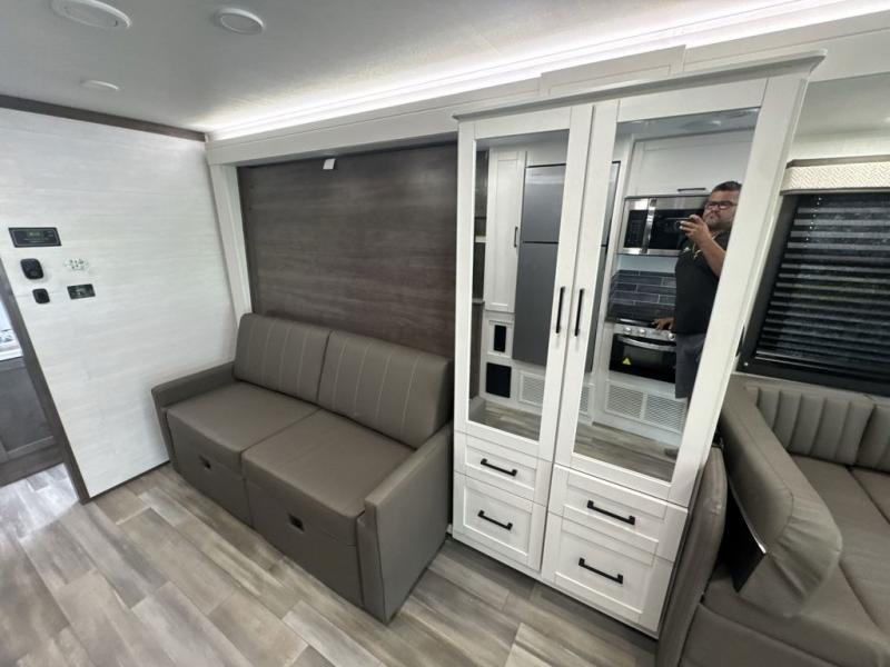 Enjoy a whole lot of comfort, fun and versatility in this coach! The queen Murphy bed and sofa combination allows you to convert between a living area and a bedroom, with a fireplace and an LED HD Smart TV. Outside, the exterior TV and 19' electric awning provide you an outdoor living space to enjoy nature and its beauty. The inside also provides a rear full bathroom including a space saving sliding door, linen storage, counter space for toiletries and a shower. You can dine at the U-shaped dinette or while sitting on the swivel captains chairs, and the cab-over bunk will be a perfect place to stay the night.