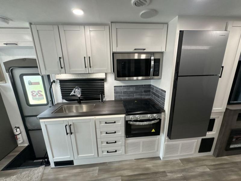 With any Odyssey Class C gas motorhome by Entegra Coach, the driver will appreciate the power from the 325 HP engine, the towing capacity from the 7,500 lb. hitch, the tire pressure monitoring system, the navigation from the Sony infotainment center with Apple CarPlay and Android Auto, plus the backup and side-view cameras when parking and driving down the highway. The kitchen offers full amenities including a recessed stainless steel sink with a cutting board sink cover, LED-lit pressed countertops, a decorative backsplash, and a pop-up charging station with 110 outlet and USB plugs to keep your smart phones charged. Get ready for luxury in a Class C, choose your favorite today!