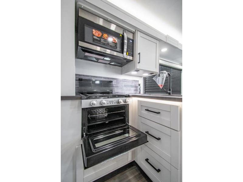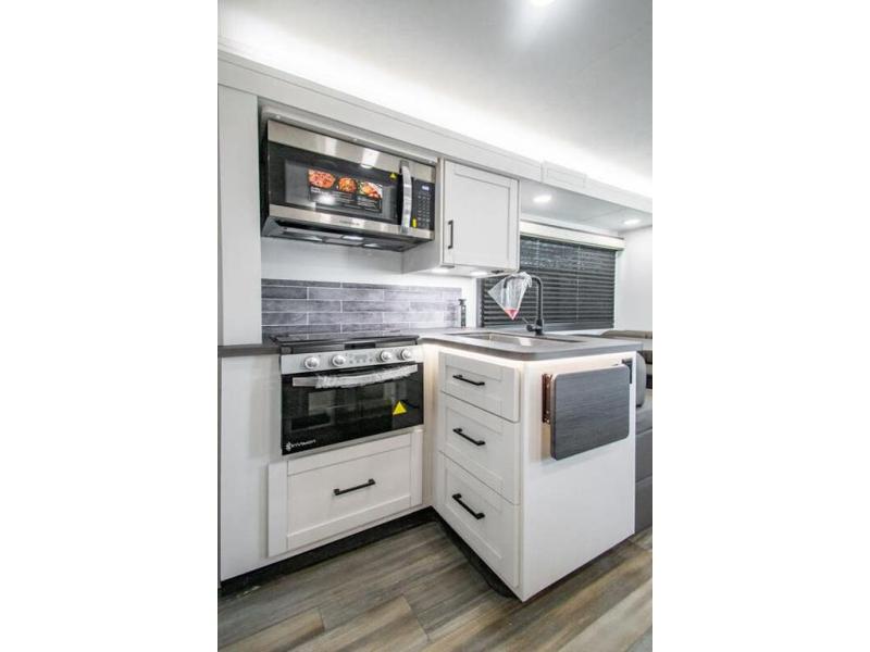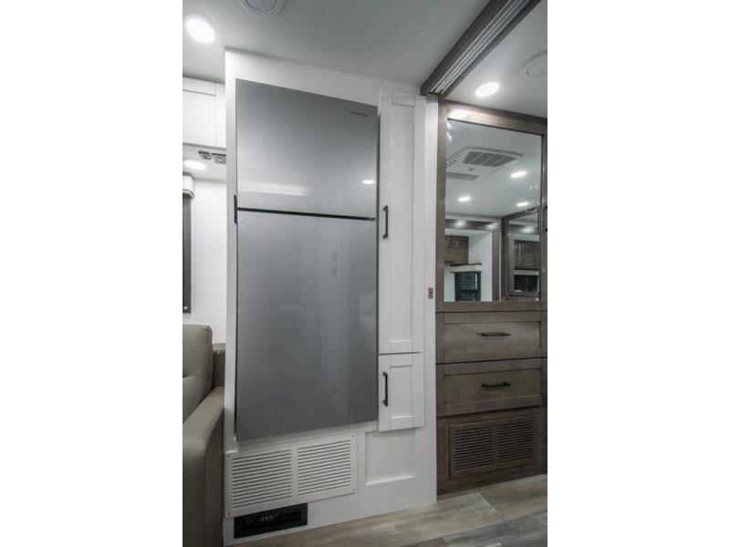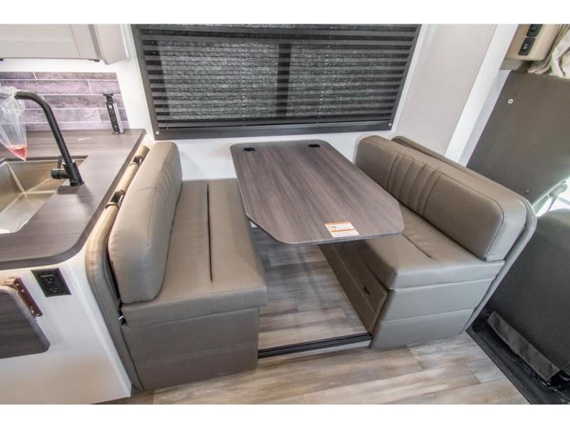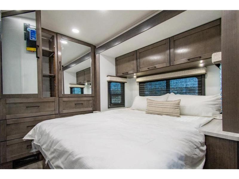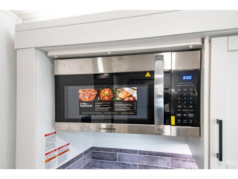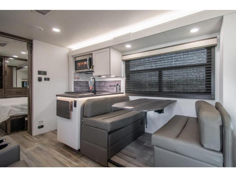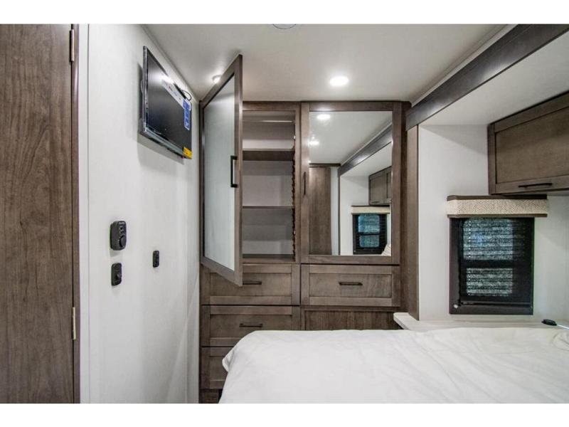 Sleep like a king after driving the scenic byways, hiking the trails and exploring the campgrounds. The rear bedroom offers a king bed slide, a wardrobe, a TV option, and a sliding door to close off the bedroom with an additional wardrobe and the corner full bathroom. The combined kitchen and living area is spacious thanks to another slide which includes a booth dinette, and kitchen amenities including a counter extension, sink, the Furrion all-in-one-cooktop and oven and a residential-size microwave. And the 8 cu. ft. refrigerator and pantry are next to the sofa so you can easily grab a beverage before sitting down. The furniture doubles as sleeping space, and the cab-over bunk is always available.