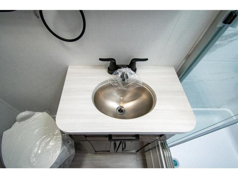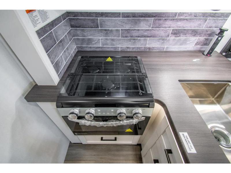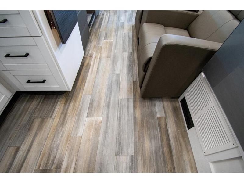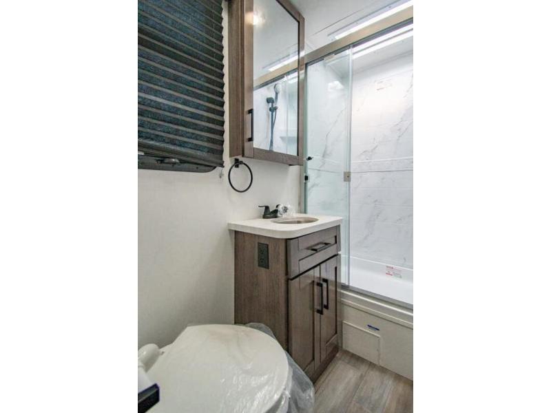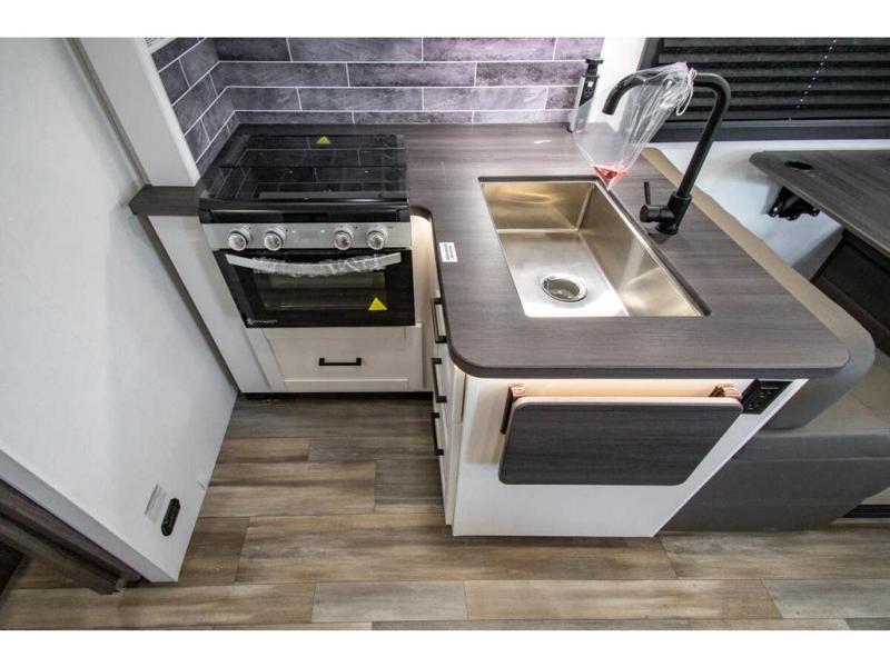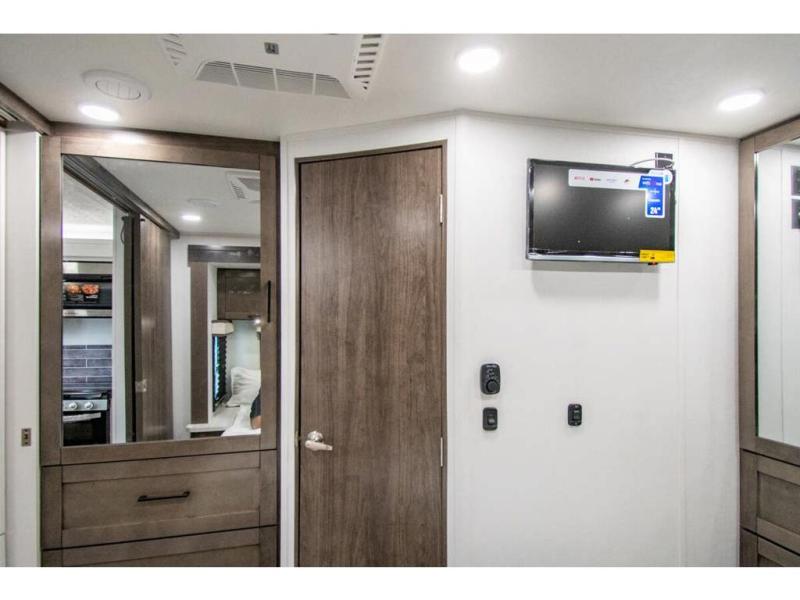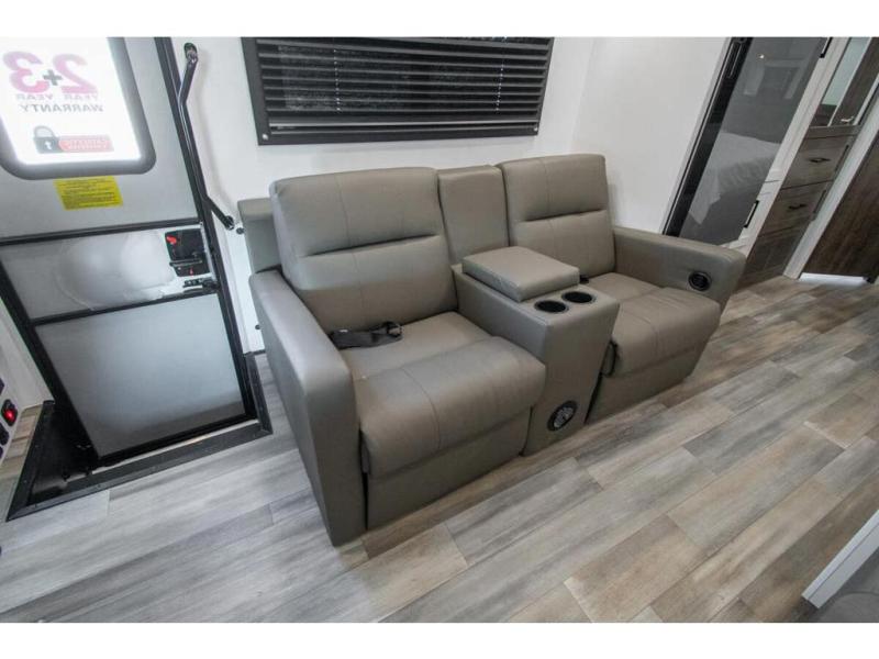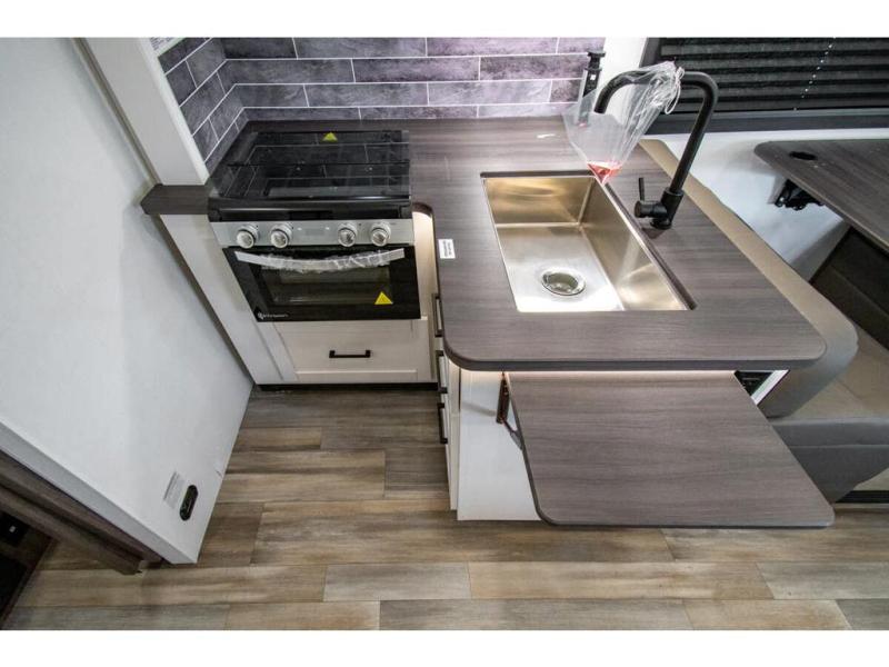 Sleep like a king after driving the scenic byways, hiking the trails and exploring the campgrounds. The rear bedroom offers a king bed slide, a wardrobe, a TV option, and a sliding door to close off the bedroom with an additional wardrobe and the corner full bathroom. The combined kitchen and living area is spacious thanks to another slide which includes a booth dinette, and kitchen amenities including a counter extension, sink, the Furrion all-in-one-cooktop and oven and a residential-size microwave. And the 8 cu. ft. refrigerator and pantry are next to the sofa so you can easily grab a beverage before sitting down. The furniture doubles as sleeping space, and the cab-over bunk is always available.