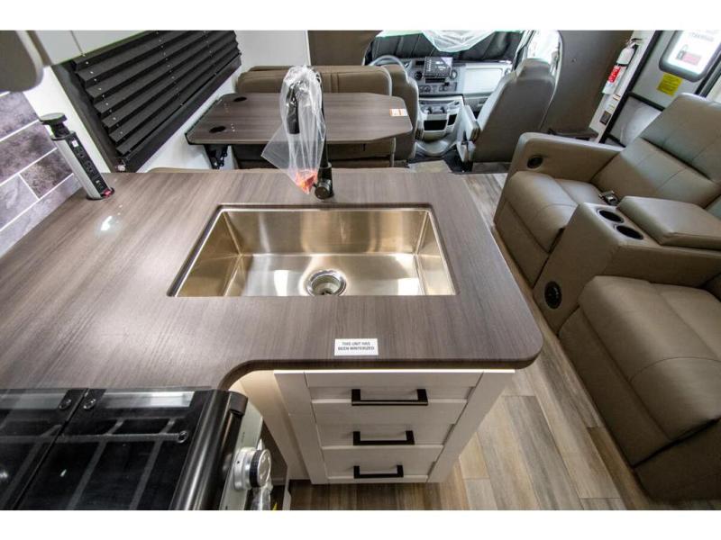 With any Odyssey Class C gas motorhome by Entegra Coach, the driver will appreciate the power from the 325 HP engine, the towing capacity from the 7,500 lb. hitch, the tire pressure monitoring system, the navigation from the Sony infotainment center with Apple CarPlay and Android Auto, plus the backup and side-view cameras when parking and driving down the highway. The kitchen offers full amenities including a recessed stainless steel sink with a cutting board sink cover, LED-lit pressed countertops, a decorative backsplash, and a pop-up charging station with 110 outlet and USB plugs to keep your smart phones charged. Get ready for luxury in a Class C, choose your favorite today!