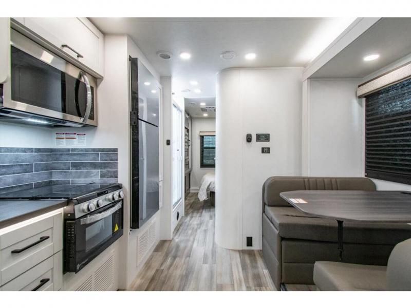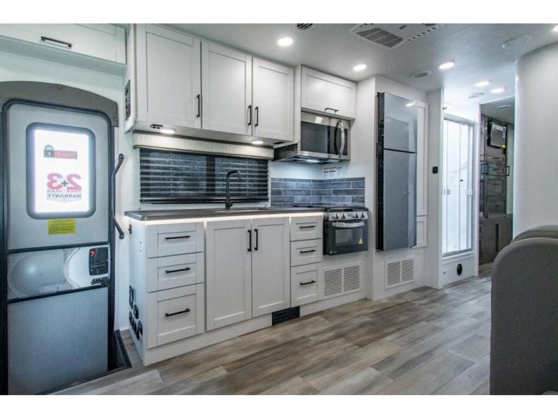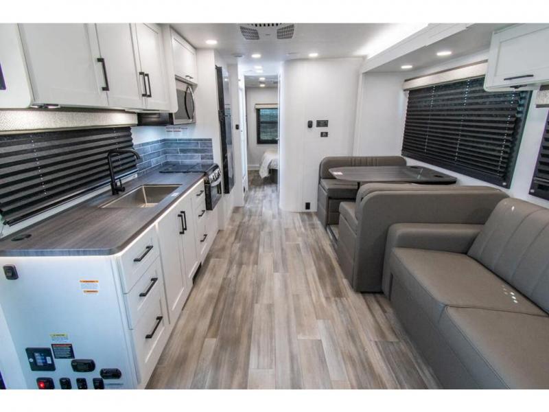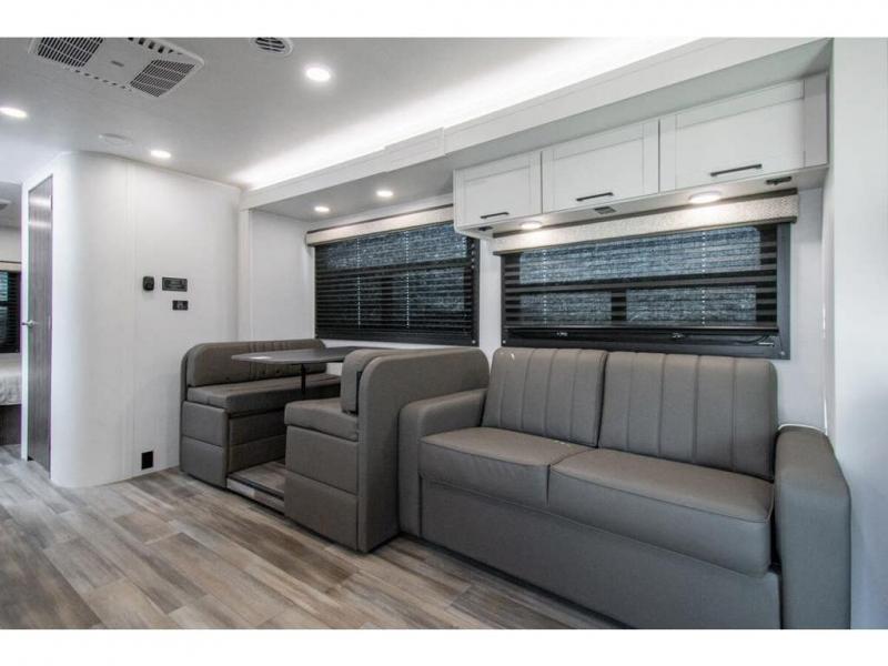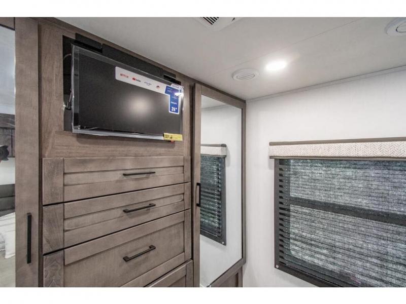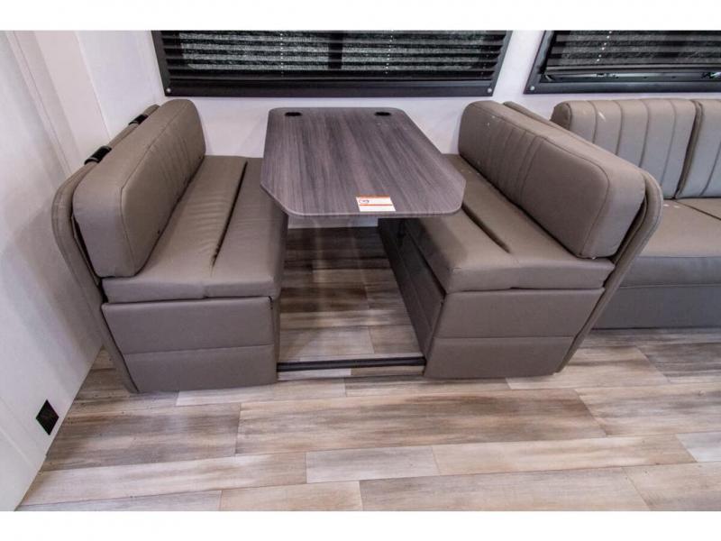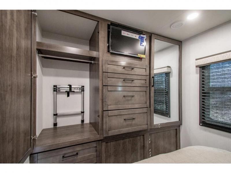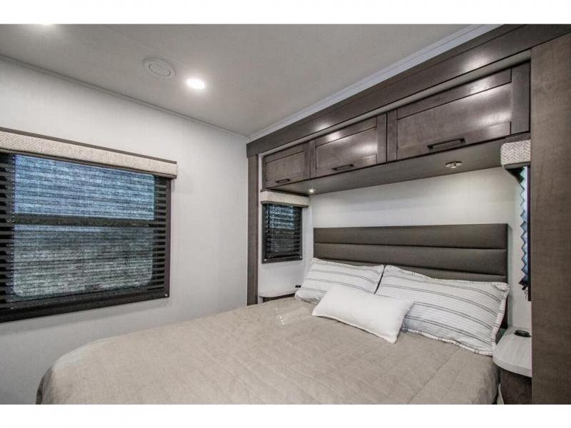 This coach allows you to take vacations in comfort and luxury with a spacious bedroom that includes a queen bed slide, dual wardrobes and a TV option for nighttime viewing, plus a way to close off the bedroom for privacy. The split bathroom gives you the ability to take a shower while another is brushing their teeth in the private toilet and sink room. You will find the main living and kitchen area to be spacious as well with a slide out that includes a booth dinette and sofa. And the cook will love the galley kitchen including the residential-size microwave and Furrion all-in-one cooktop and oven. And the cab-over bunk plus the furniture offers extra sleeping space. There are many more features to enjoy, take a look!