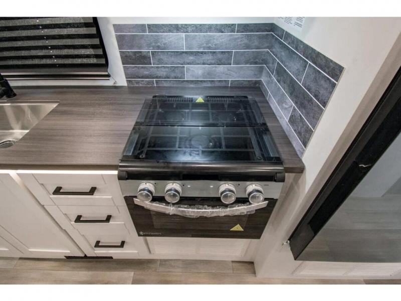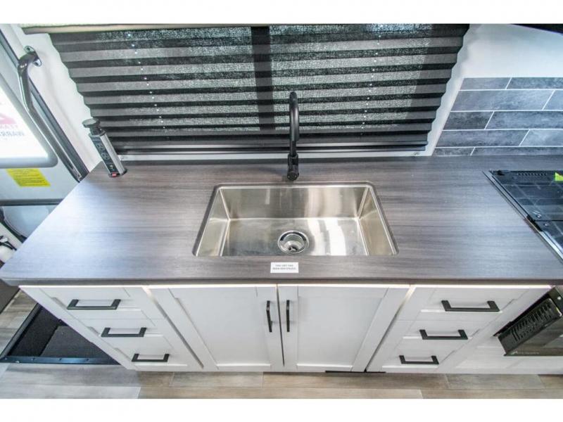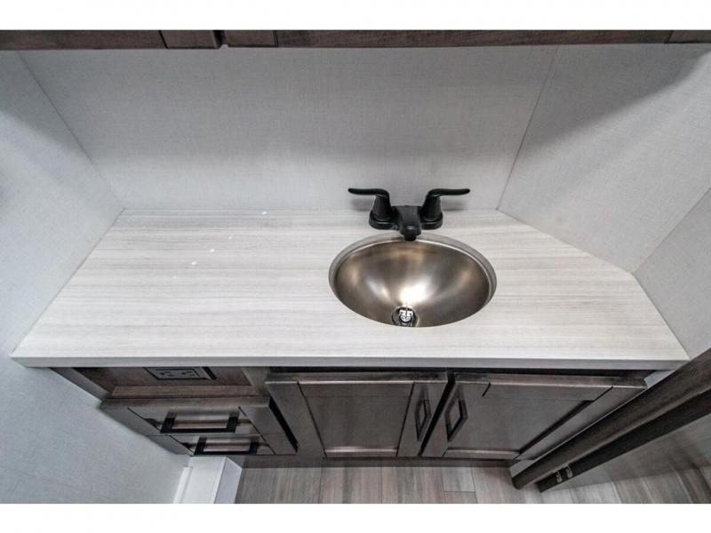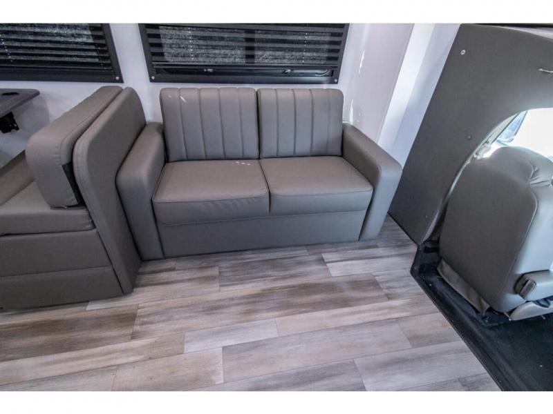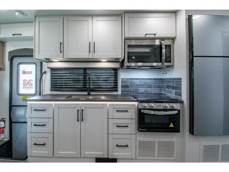 With any Odyssey Class C gas motorhome by Entegra Coach, the driver will appreciate the power from the 325 HP engine, the towing capacity from the 7,500 lb. hitch, the tire pressure monitoring system, the navigation from the Sony infotainment center with Apple CarPlay and Android Auto, plus the backup and side-view cameras when parking and driving down the highway. The kitchen offers full amenities including a recessed stainless steel sink with a cutting board sink cover, LED-lit pressed countertops, a decorative backsplash, and a pop-up charging station with 110 outlet and USB plugs to keep your smart phones charged. Get ready for luxury in a Class C, choose your favorite today!