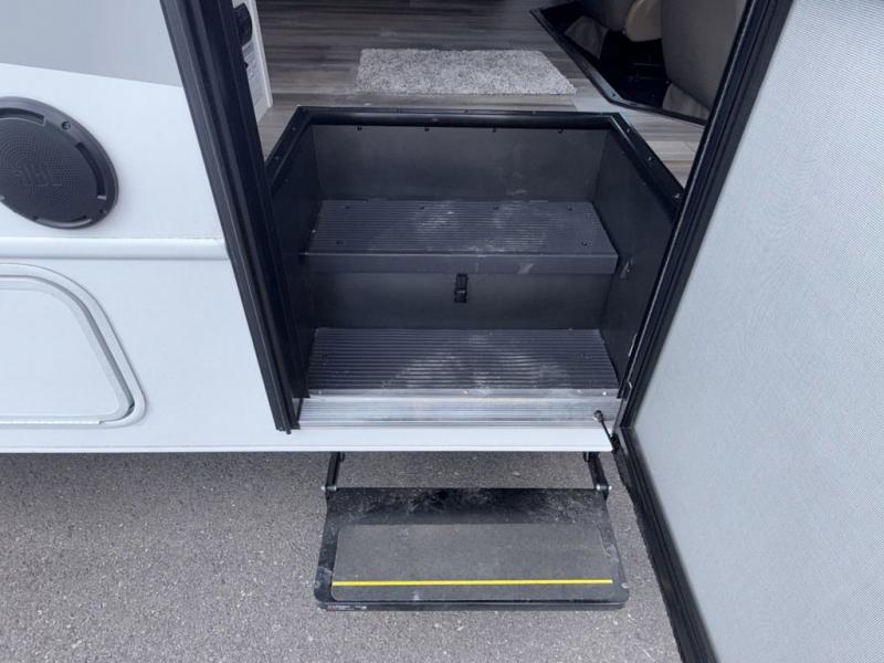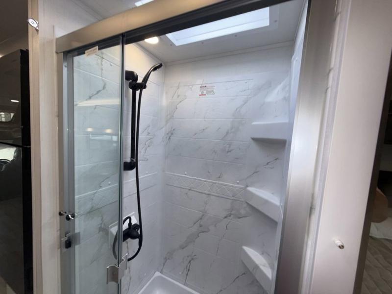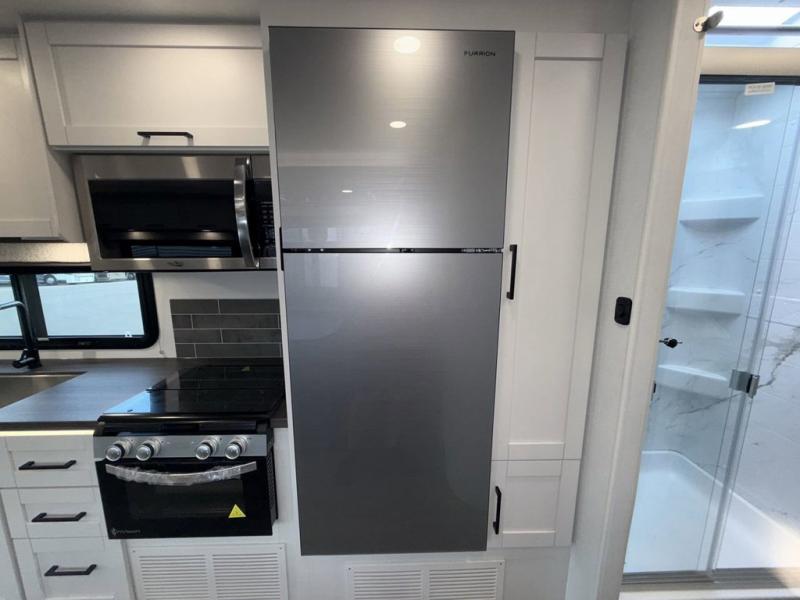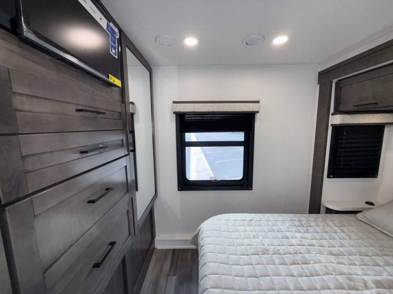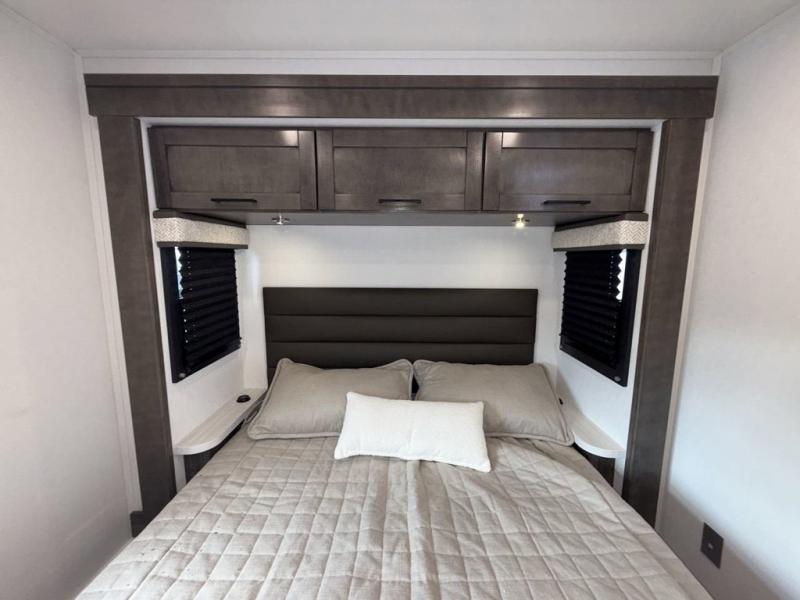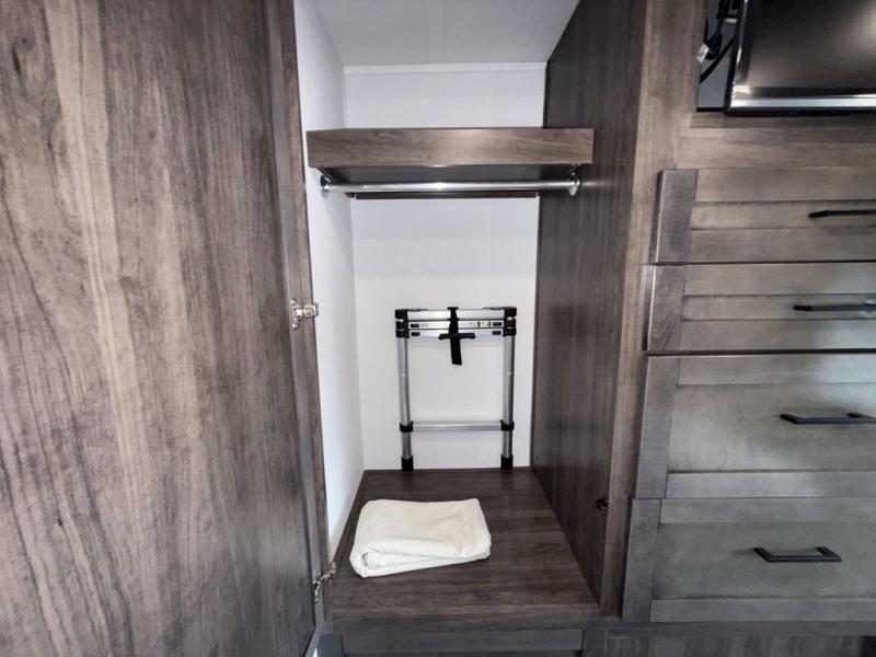 This coach allows you to take vacations in comfort and luxury with a spacious bedroom that includes a queen bed slide, dual wardrobes and a TV option for nighttime viewing, plus a way to close off the bedroom for privacy. The split bathroom gives you the ability to take a shower while another is brushing their teeth in the private toilet and sink room. You will find the main living and kitchen area to be spacious as well with a slide out that includes a booth dinette and sofa. And the cook will love the galley kitchen including the residential-size microwave and Furrion all-in-one cooktop and oven. And the cab-over bunk plus the furniture offers extra sleeping space. There are many more features to enjoy, take a look!