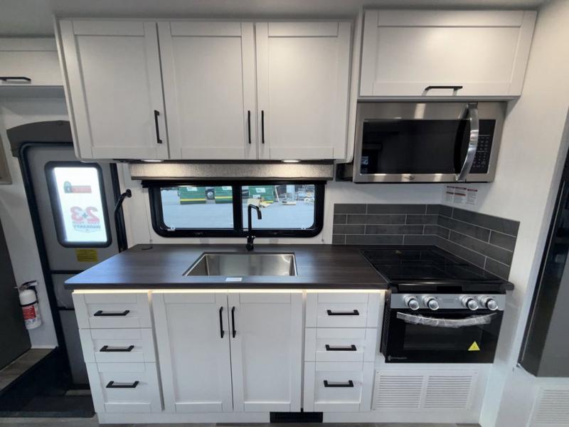 With any Odyssey Class C gas motorhome by Entegra Coach, the driver will appreciate the power from the 325 HP engine, the towing capacity from the 7,500 lb. hitch, the tire pressure monitoring system, the navigation from the Sony infotainment center with Apple CarPlay and Android Auto, plus the backup and side-view cameras when parking and driving down the highway. The kitchen offers full amenities including a recessed stainless steel sink with a cutting board sink cover, LED-lit pressed countertops, a decorative backsplash, and a pop-up charging station with 110 outlet and USB plugs to keep your smart phones charged. Get ready for luxury in a Class C, choose your favorite today!