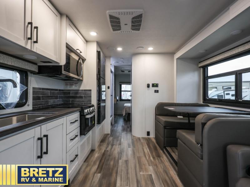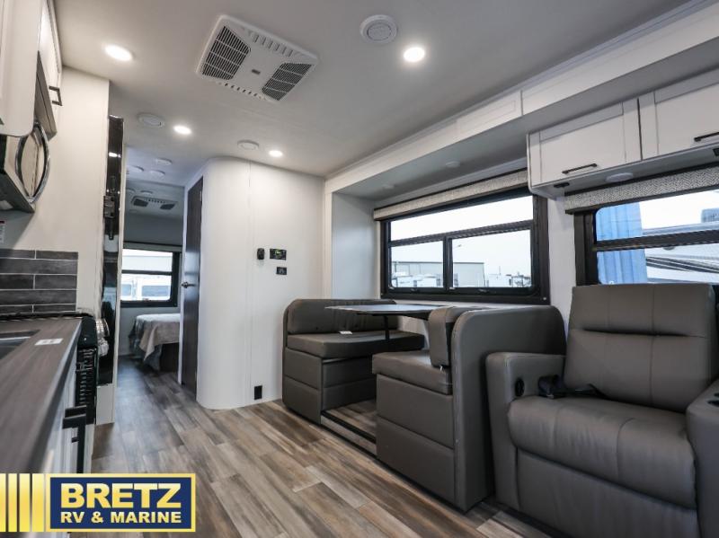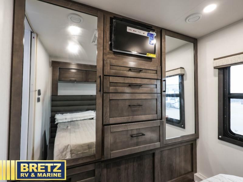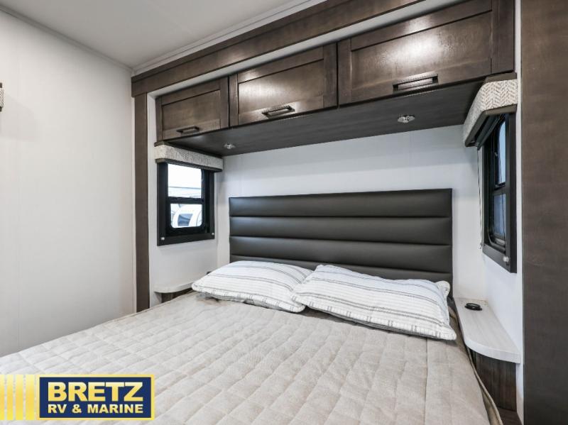 This coach allows you to take vacations in comfort and luxury with a spacious bedroom that includes a queen bed slide, dual wardrobes and a TV option for nighttime viewing, plus a way to close off the bedroom for privacy. The split bathroom gives you the ability to take a shower while another is brushing their teeth in the private toilet and sink room. You will find the main living and kitchen area to be spacious as well with a slide out that includes a booth dinette and sofa. And the cook will love the galley kitchen including the residential-size microwave and Furrion all-in-one cooktop and oven. And the cab-over bunk plus the furniture offers extra sleeping space. There are many more features to enjoy, take a look!