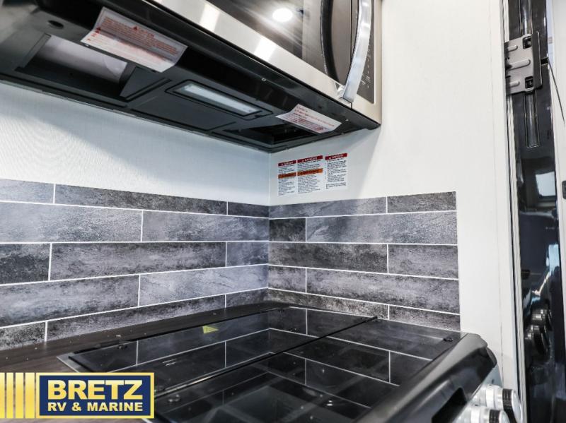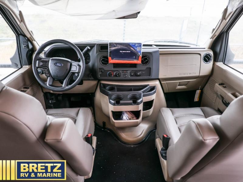 With any Odyssey Class C gas motorhome by Entegra Coach, the driver will appreciate the power from the 325 HP engine, the towing capacity from the 7,500 lb. hitch, the tire pressure monitoring system, the navigation from the Sony infotainment center with Apple CarPlay and Android Auto, plus the backup and side-view cameras when parking and driving down the highway. The kitchen offers full amenities including a recessed stainless steel sink with a cutting board sink cover, LED-lit pressed countertops, a decorative backsplash, and a pop-up charging station with 110 outlet and USB plugs to keep your smart phones charged. Get ready for luxury in a Class C, choose your favorite today!