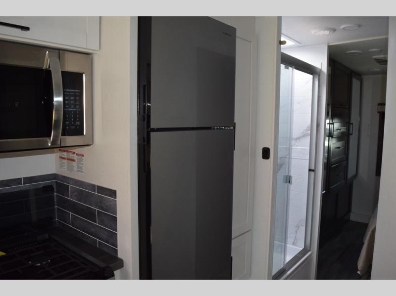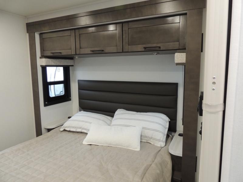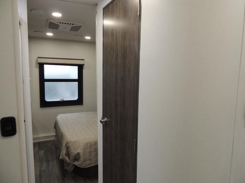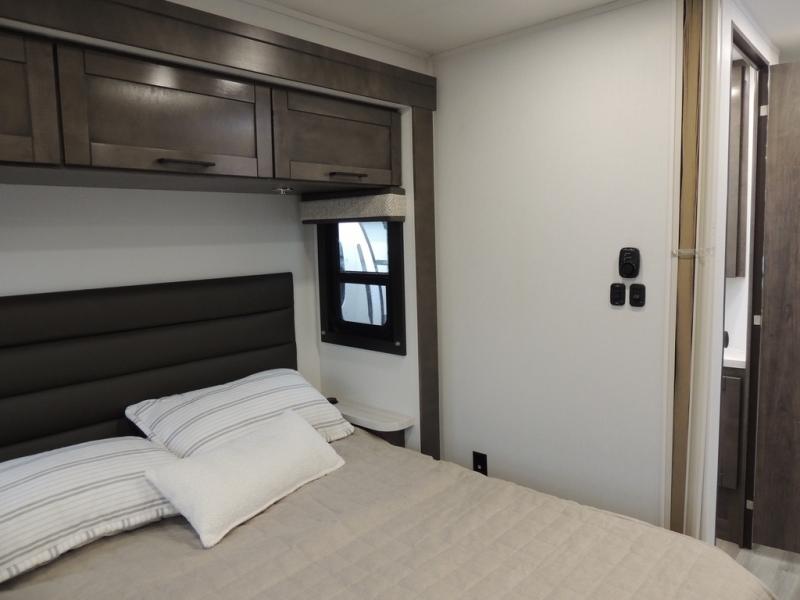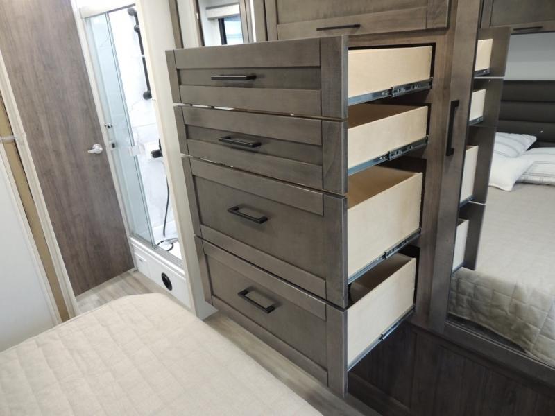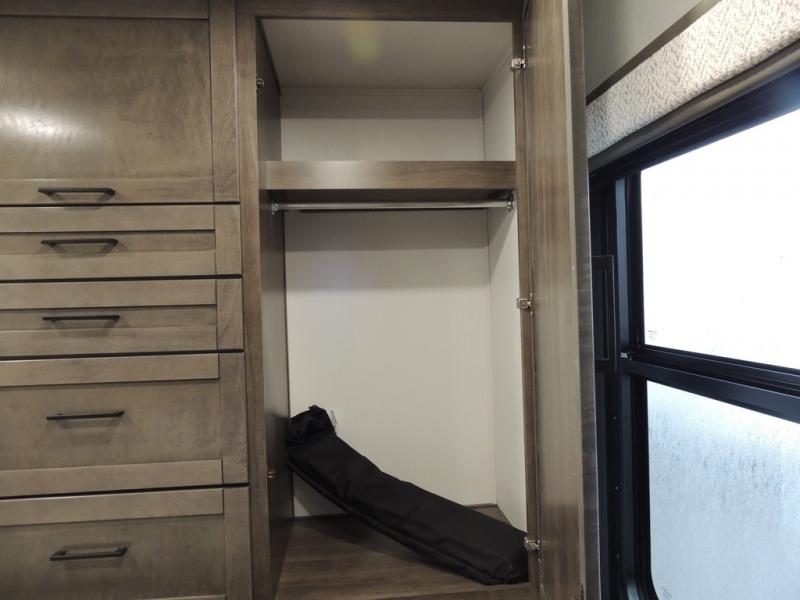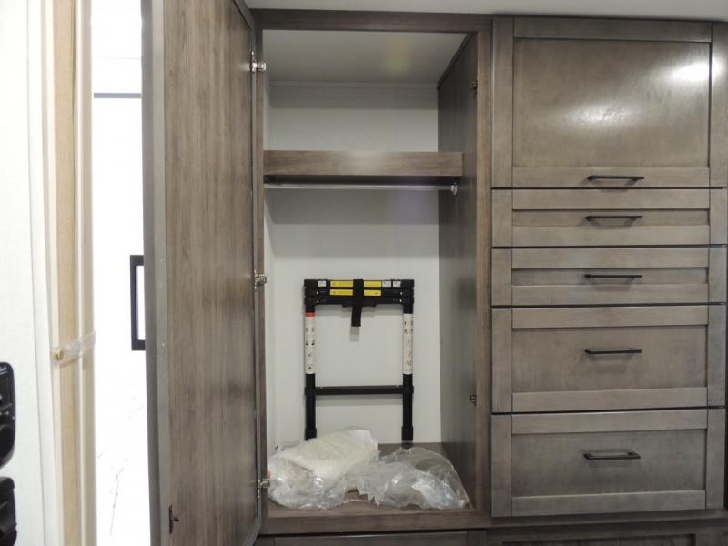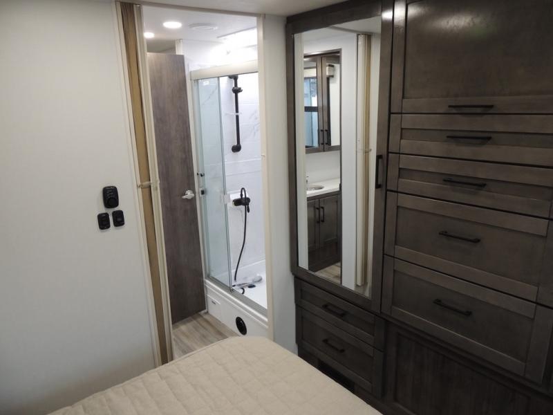 This coach allows you to take vacations in comfort and luxury with a spacious bedroom that includes a queen bed slide, dual wardrobes and a TV option for nighttime viewing, plus a way to close off the bedroom for privacy. The split bathroom gives you the ability to take a shower while another is brushing their teeth in the private toilet and sink room. You will find the main living and kitchen area to be spacious as well with a slide out that includes a booth dinette and sofa. And the cook will love the galley kitchen including the residential-size microwave and Furrion all-in-one cooktop and oven. And the cab-over bunk plus the furniture offers extra sleeping space. There are many more features to enjoy, take a look!