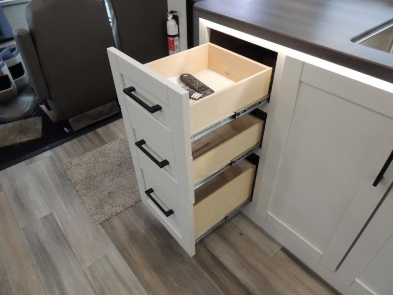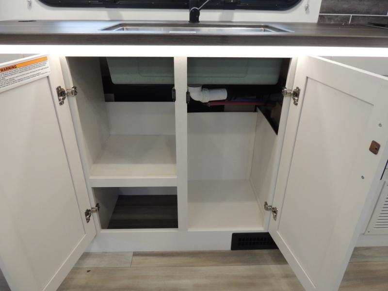 With any Odyssey Class C gas motorhome by Entegra Coach, the driver will appreciate the power from the 325 HP engine, the towing capacity from the 7,500 lb. hitch, the tire pressure monitoring system, the navigation from the Sony infotainment center with Apple CarPlay and Android Auto, plus the backup and side-view cameras when parking and driving down the highway. The kitchen offers full amenities including a recessed stainless steel sink with a cutting board sink cover, LED-lit pressed countertops, a decorative backsplash, and a pop-up charging station with 110 outlet and USB plugs to keep your smart phones charged. Get ready for luxury in a Class C, choose your favorite today!