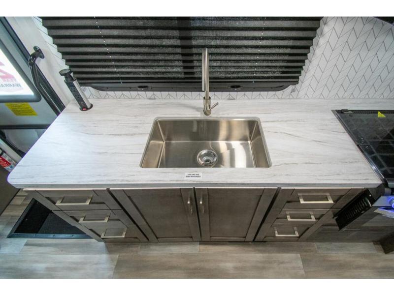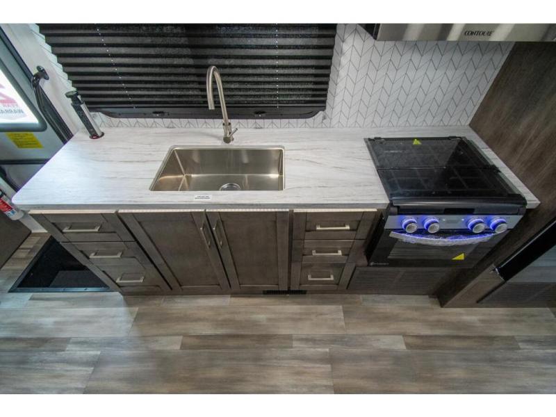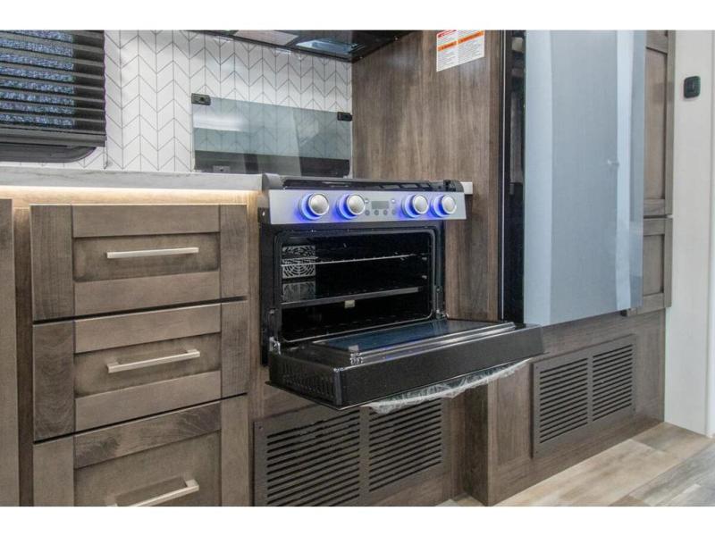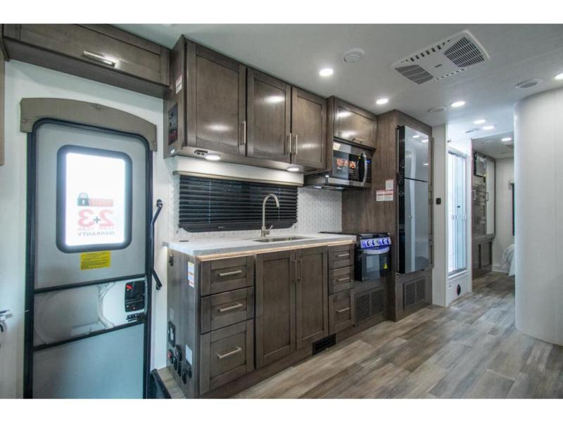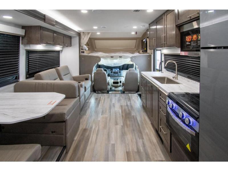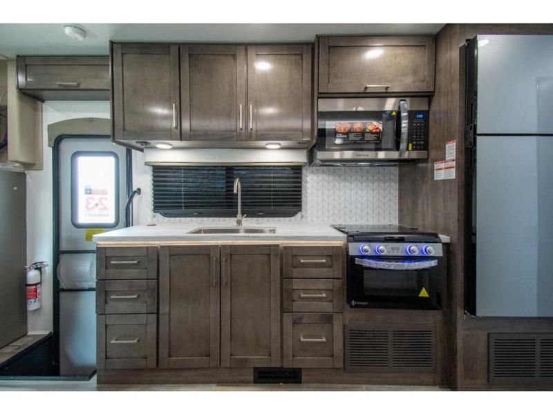 With any Odyssey Class C gas motorhome by Entegra Coach, the driver will appreciate the power from the 325 HP engine, the towing capacity from the 7,500 lb. hitch, the tire pressure monitoring system, the navigation from the Sony infotainment center with Apple CarPlay and Android Auto, plus the backup and side-view cameras when parking and driving down the highway. The kitchen offers full amenities including a recessed stainless steel sink with a cutting board sink cover, LED-lit pressed countertops, a decorative backsplash, and a pop-up charging station with 110 outlet and USB plugs to keep your smart phones charged. Get ready for luxury in a Class C, choose your favorite today!