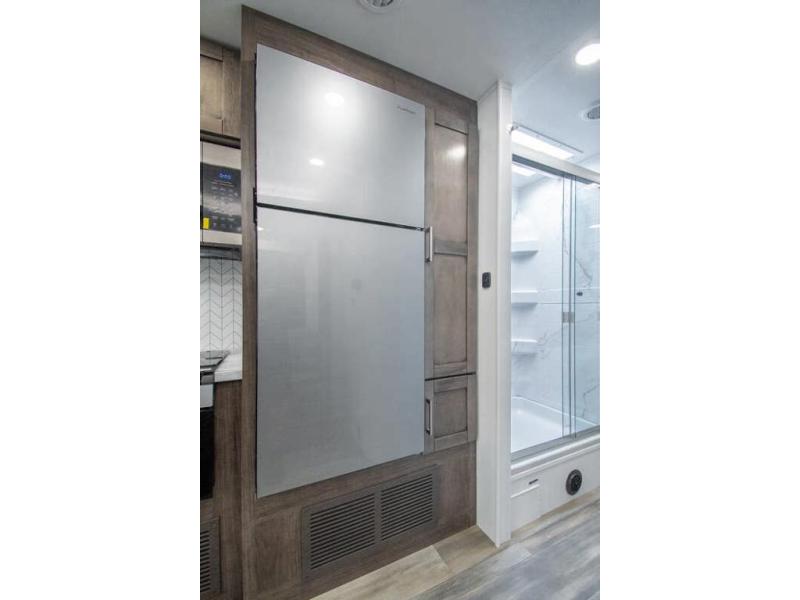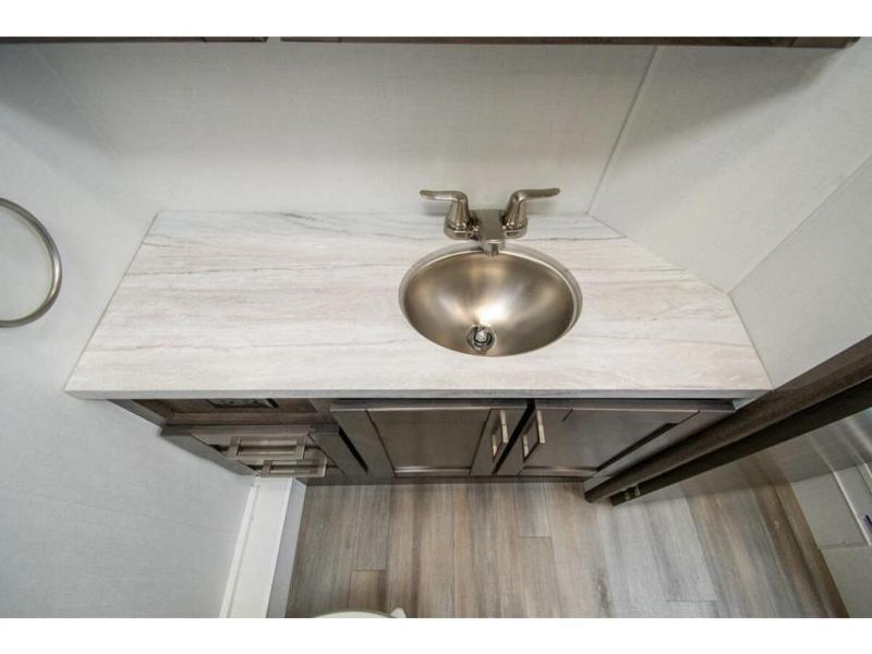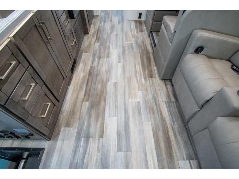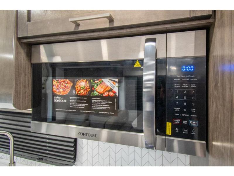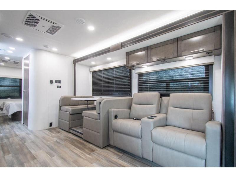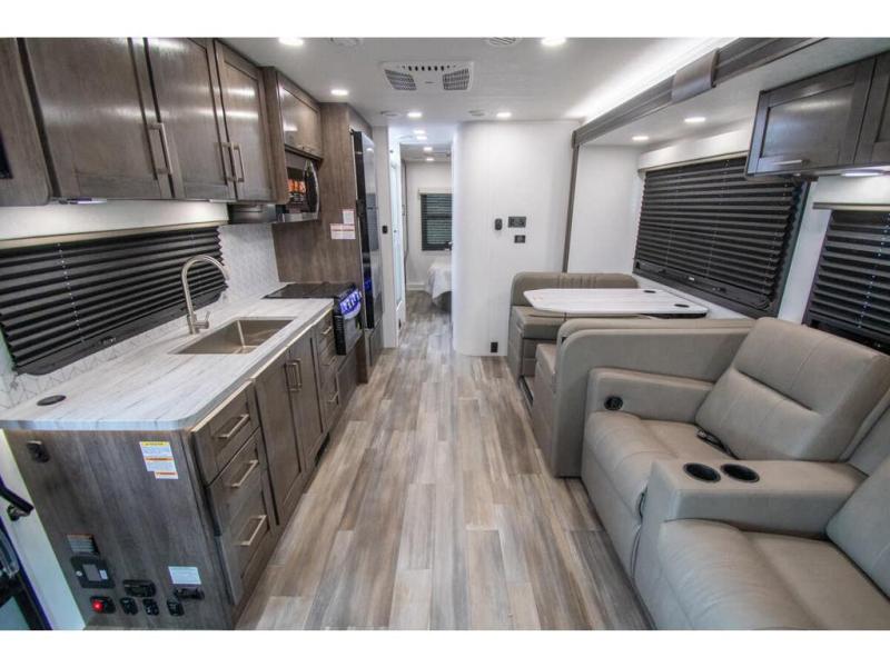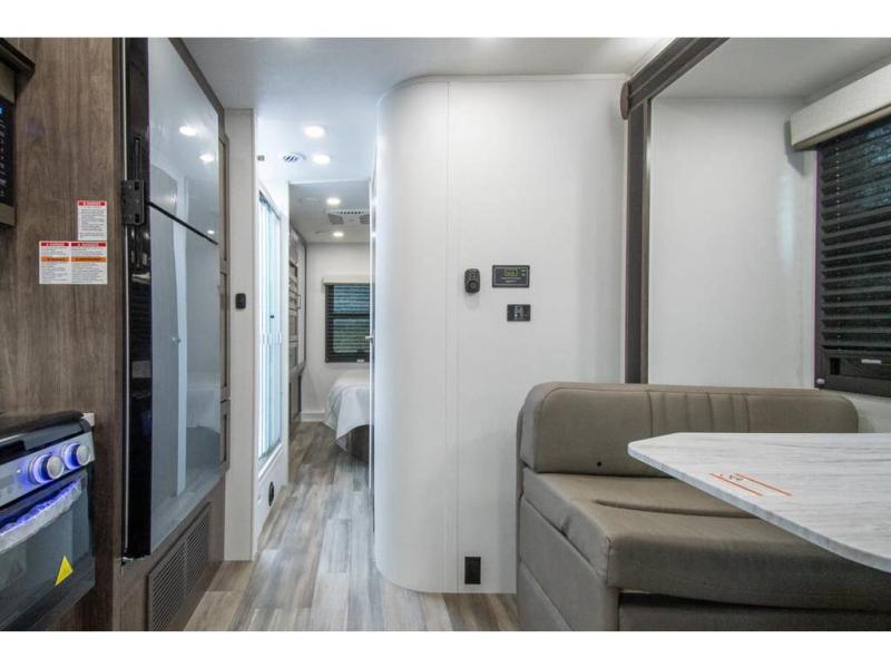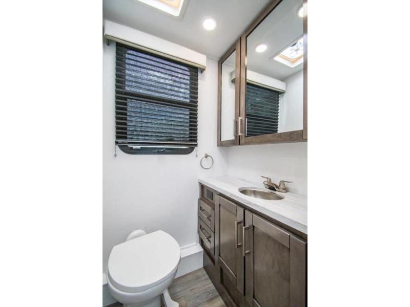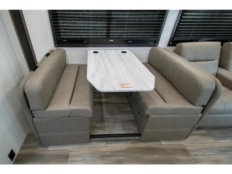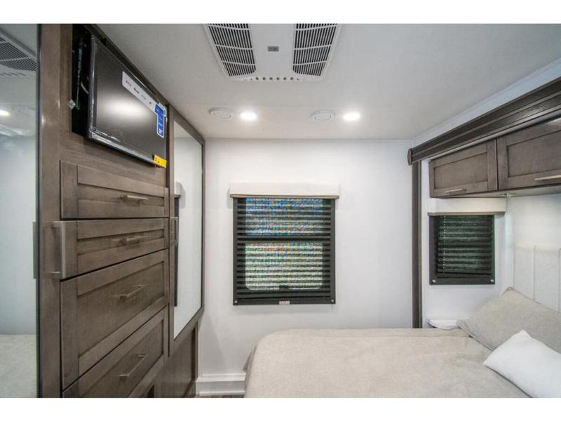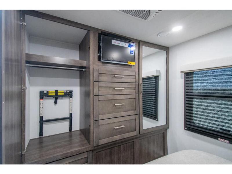 This coach allows you to take vacations in comfort and luxury with a spacious bedroom that includes a queen bed slide, dual wardrobes and a TV option for nighttime viewing, plus a way to close off the bedroom for privacy. The split bathroom gives you the ability to take a shower while another is brushing their teeth in the private toilet and sink room. You will find the main living and kitchen area to be spacious as well with a slide out that includes a booth dinette and sofa. And the cook will love the galley kitchen including the residential-size microwave and Furrion all-in-one cooktop and oven. And the cab-over bunk plus the furniture offers extra sleeping space. There are many more features to enjoy, take a look!