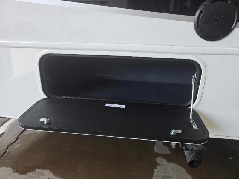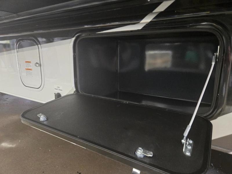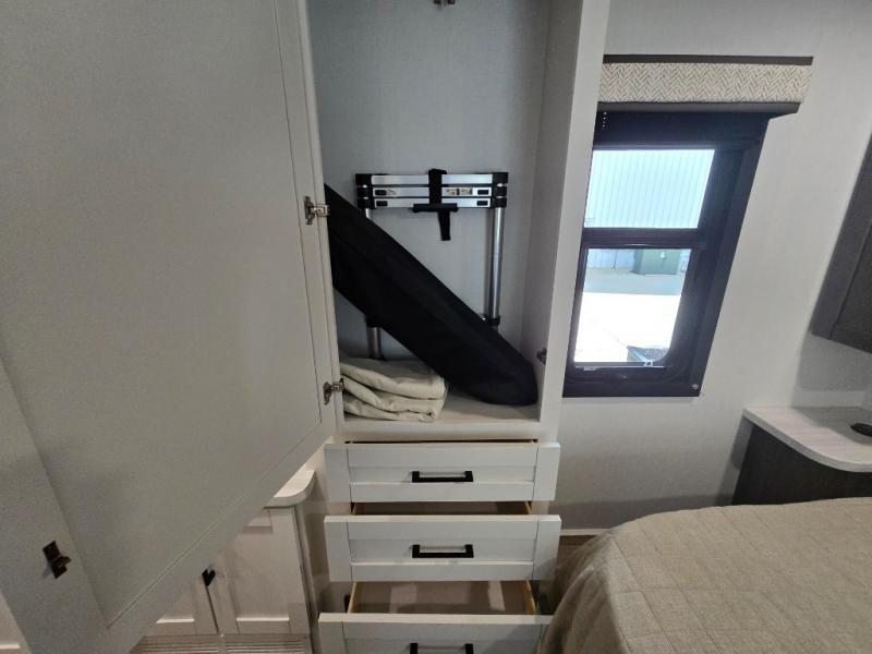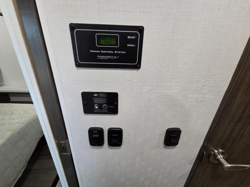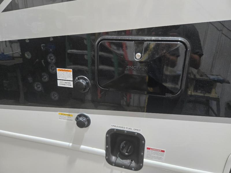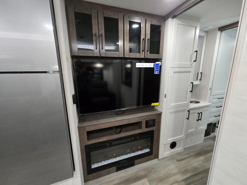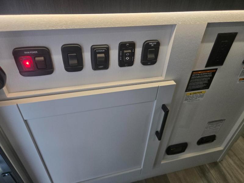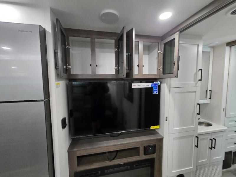 Relax inside while sitting on the sofa, at the booth dinette or on the swivel captains chairs while enjoying the fireplace and 50" TV, or unwind outside under the 18' electric awning while watching the exterior TV. After shopping in town or hiking the trails you can get cleaned up in the private toilet and shower room then brush your teeth in the bathroom sink a few steps outside the door. The private bedroom includes a space saving sliding door, a unique rear queen bed slide, plus storage. The cook will enjoy making meals using the residential-size microwave and Furrion all-in-one cooktop and oven, then storing leftovers in the 8 cu. ft. refrigerator. And the L-shaped counter with sink will come in handy.
