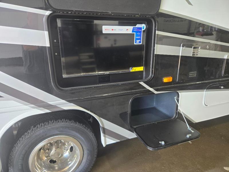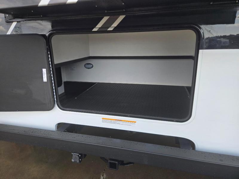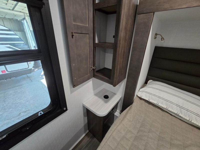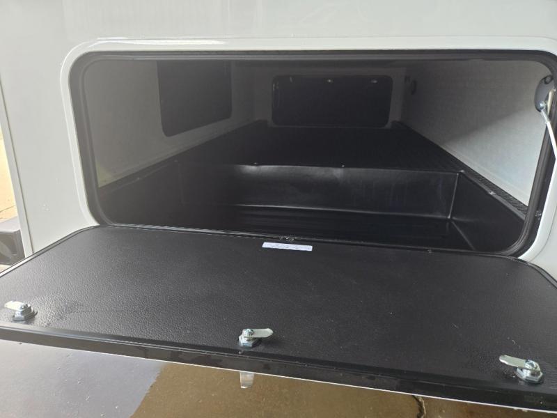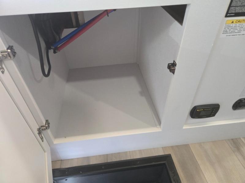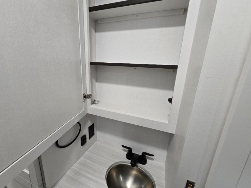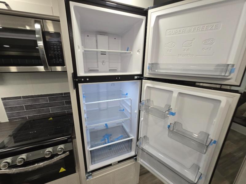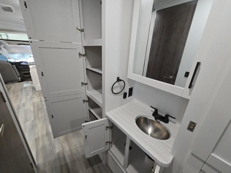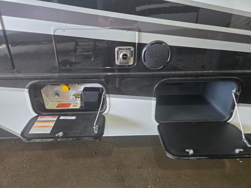 Relax inside while sitting on the sofa, at the booth dinette or on the swivel captains chairs while enjoying the fireplace and 50" TV, or unwind outside under the 18' electric awning while watching the exterior TV. After shopping in town or hiking the trails you can get cleaned up in the private toilet and shower room then brush your teeth in the bathroom sink a few steps outside the door. The private bedroom includes a space saving sliding door, a unique rear queen bed slide, plus storage. The cook will enjoy making meals using the residential-size microwave and Furrion all-in-one cooktop and oven, then storing leftovers in the 8 cu. ft. refrigerator. And the L-shaped counter with sink will come in handy.
