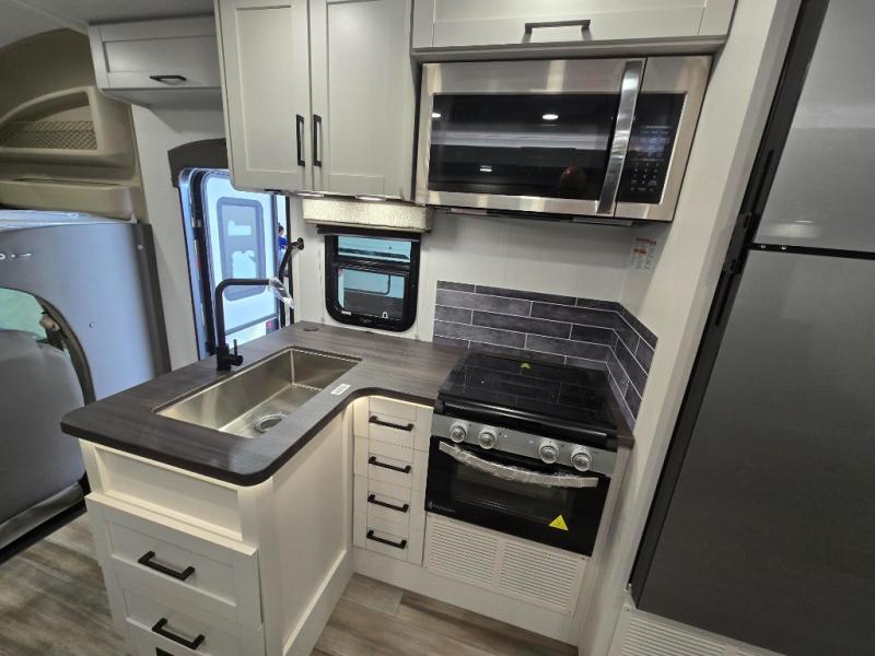 With any Odyssey Class C gas motorhome by Entegra Coach, the driver will appreciate the power from the 325 HP engine, the towing capacity from the 7,500 lb. hitch, the tire pressure monitoring system, the navigation from the Sony infotainment center with Apple CarPlay and Android Auto, plus the backup and side-view cameras when parking and driving down the highway. The kitchen offers full amenities including a recessed stainless steel sink with a cutting board sink cover, LED-lit pressed countertops, a decorative backsplash, and a pop-up charging station with 110 outlet and USB plugs to keep your smart phones charged. Get ready for luxury in a Class C, choose your favorite today!