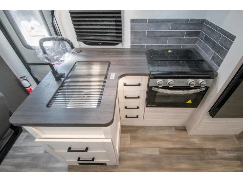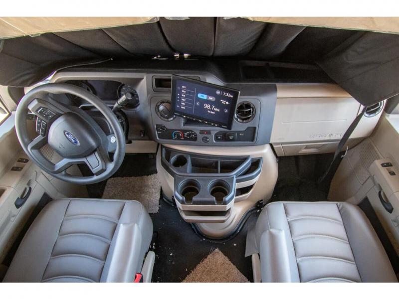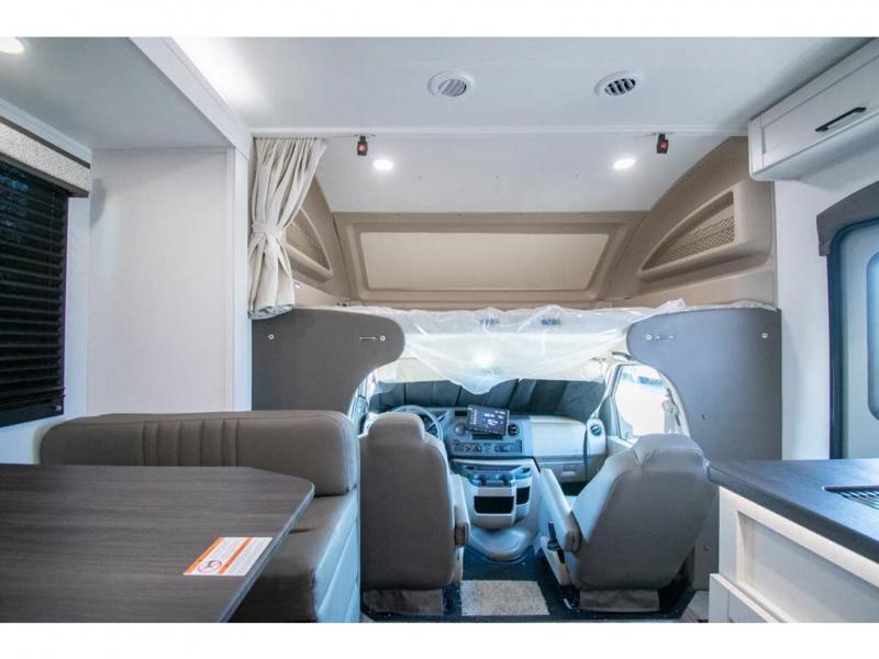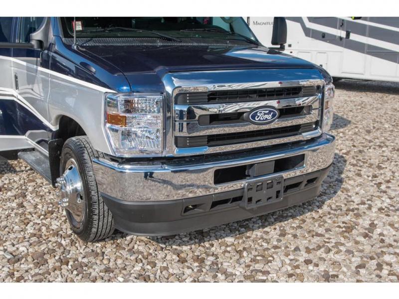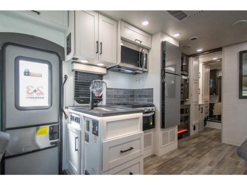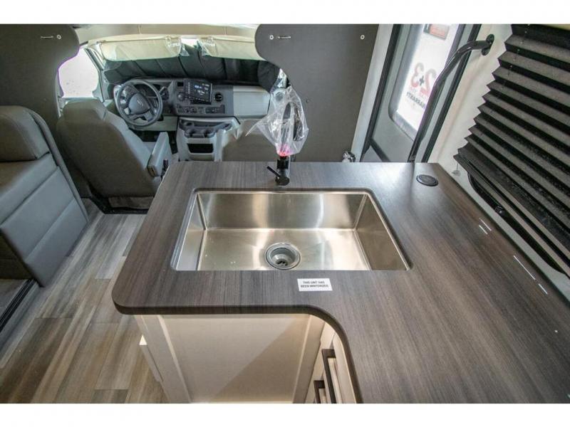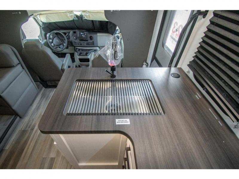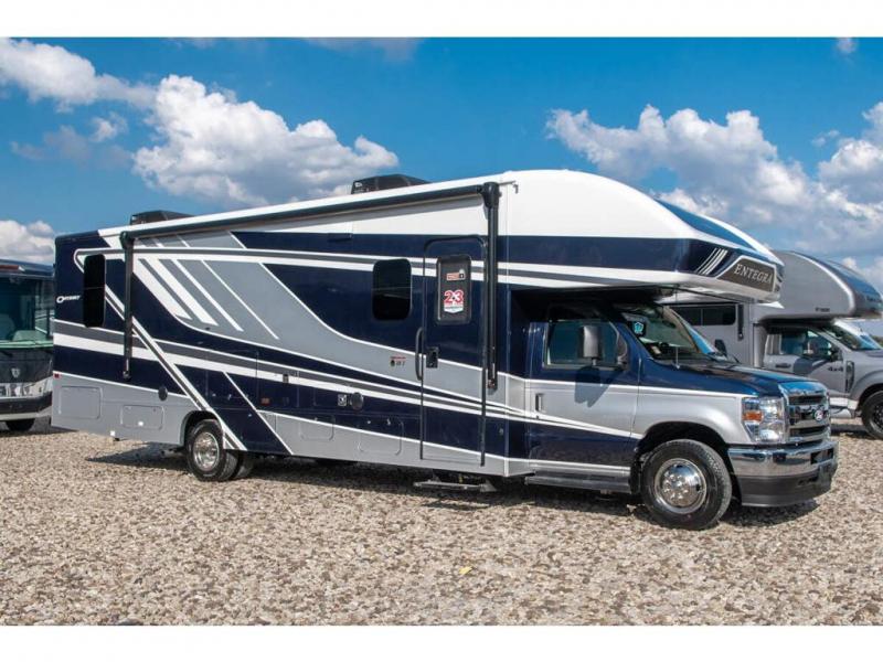With any Odyssey Class C gas motorhome by Entegra Coach, the driver will appreciate the power from the 325 HP engine, the towing capacity from the 7,500 lb. hitch, the tire pressure monitoring system, the navigation from the Sony infotainment center with Apple CarPlay and Android Auto, plus the backup and side-view cameras when parking and driving down the highway. The kitchen offers full amenities including a recessed stainless steel sink with a cutting board sink cover, LED-lit pressed countertops, a decorative backsplash, and a pop-up charging station with 110 outlet and USB plugs to keep your smart phones charged. Get ready for luxury in a Class C, choose your favorite today!