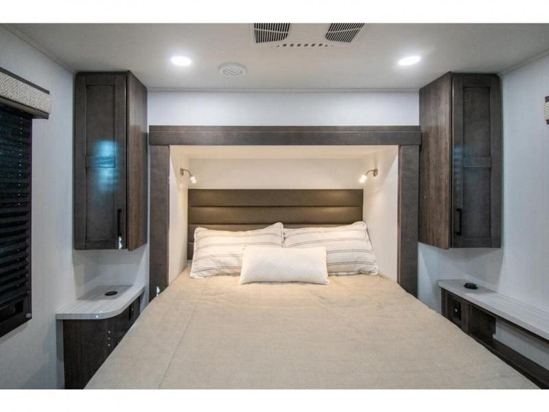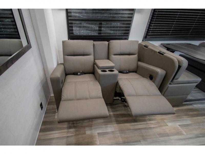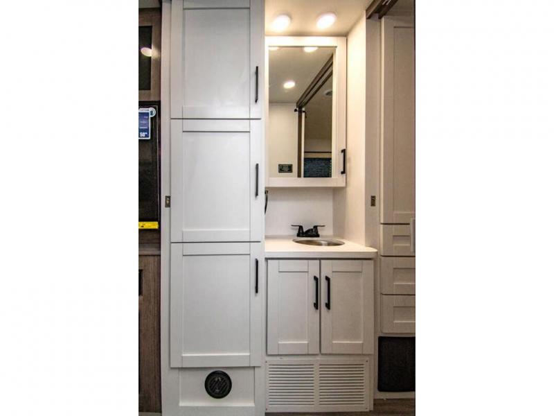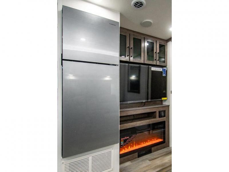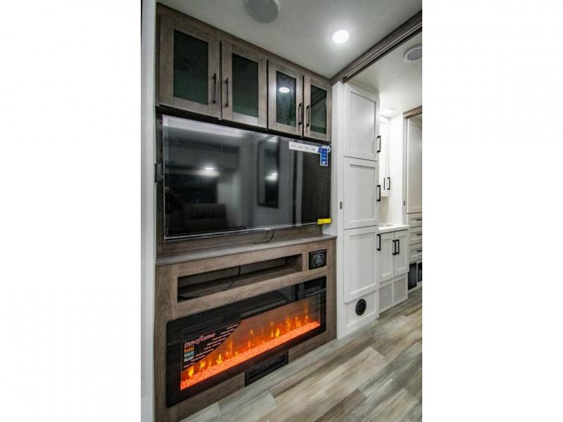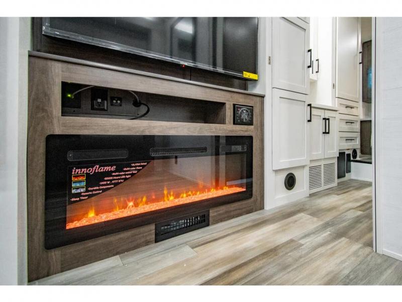 Relax inside while sitting on the sofa, at the booth dinette or on the swivel captains chairs while enjoying the fireplace and 50" TV, or unwind outside under the 18' electric awning while watching the exterior TV. After shopping in town or hiking the trails you can get cleaned up in the private toilet and shower room then brush your teeth in the bathroom sink a few steps outside the door. The private bedroom includes a space saving sliding door, a unique rear queen bed slide, plus storage. The cook will enjoy making meals using the residential-size microwave and Furrion all-in-one cooktop and oven, then storing leftovers in the 8 cu. ft. refrigerator. And the L-shaped counter with sink will come in handy.