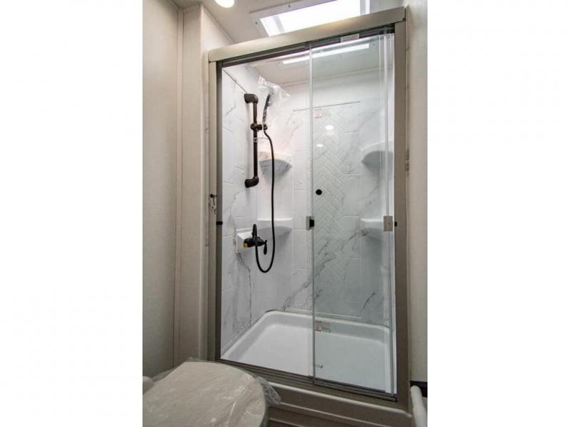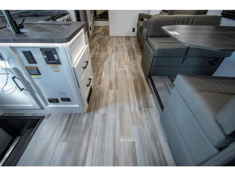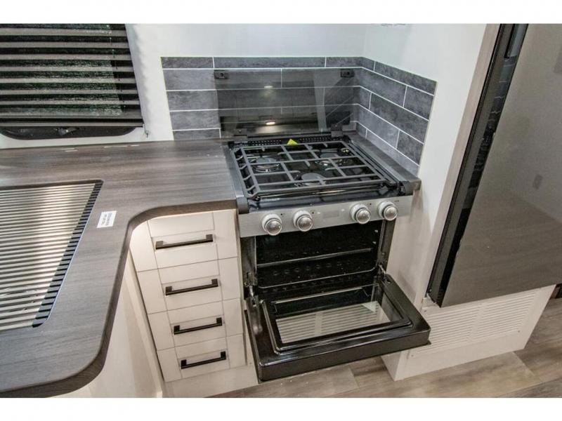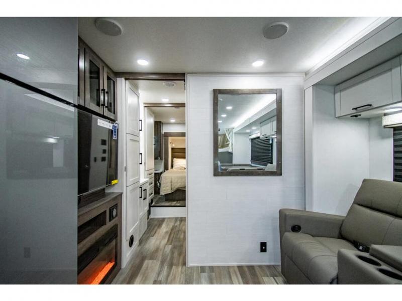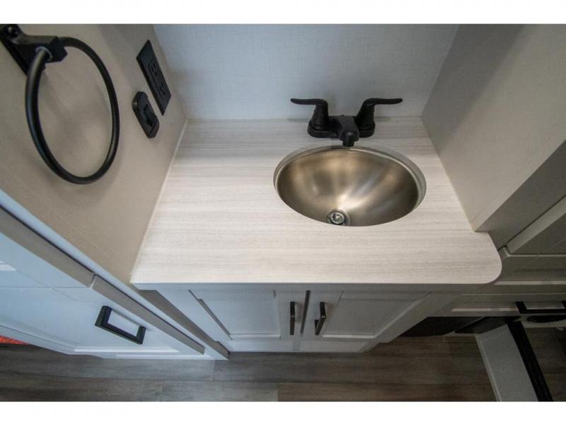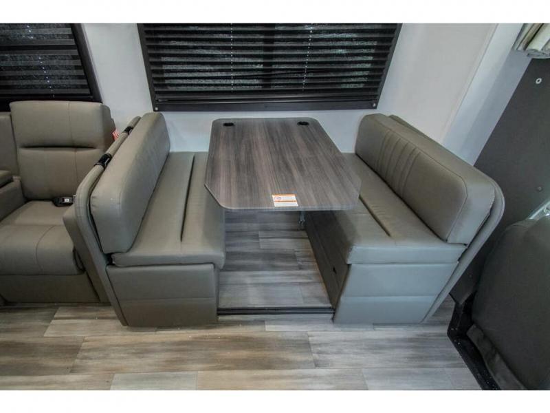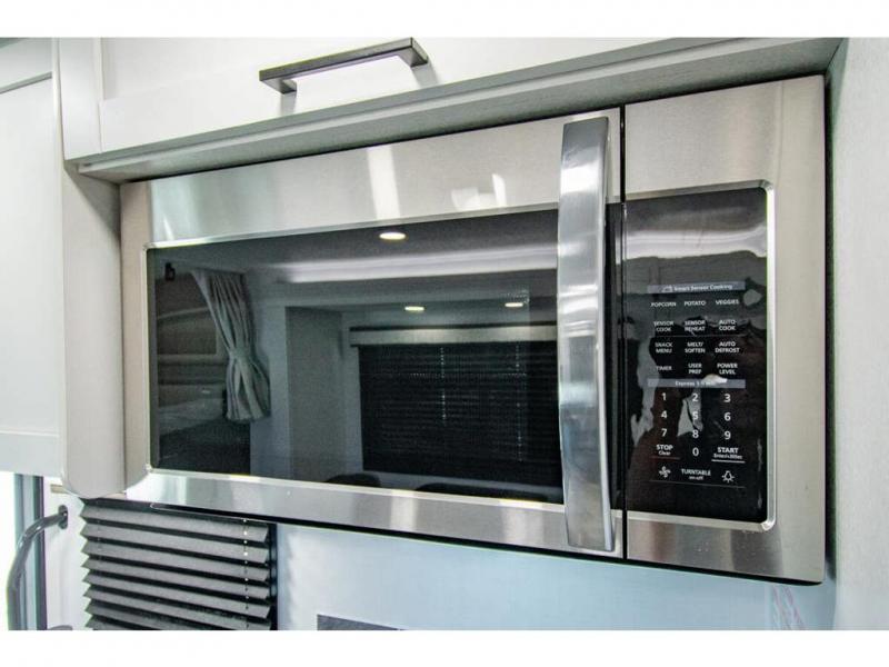 Relax inside while sitting on the sofa, at the booth dinette or on the swivel captains chairs while enjoying the fireplace and 50" TV, or unwind outside under the 18' electric awning while watching the exterior TV. After shopping in town or hiking the trails you can get cleaned up in the private toilet and shower room then brush your teeth in the bathroom sink a few steps outside the door. The private bedroom includes a space saving sliding door, a unique rear queen bed slide, plus storage. The cook will enjoy making meals using the residential-size microwave and Furrion all-in-one cooktop and oven, then storing leftovers in the 8 cu. ft. refrigerator. And the L-shaped counter with sink will come in handy.