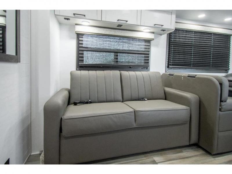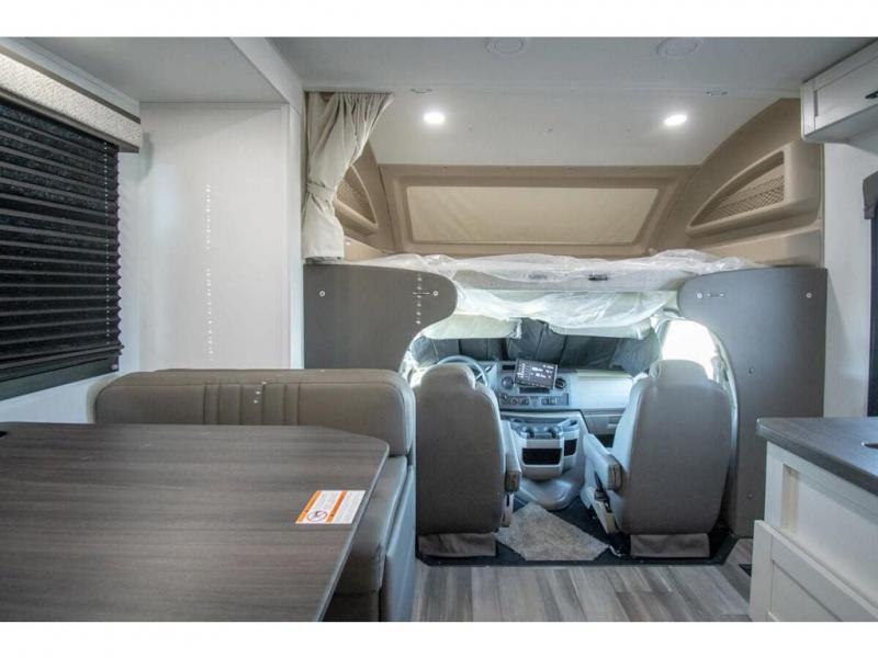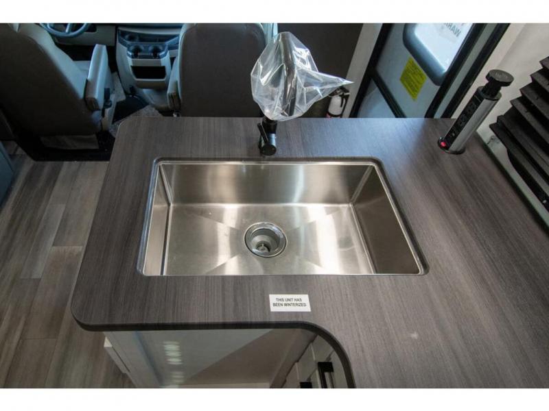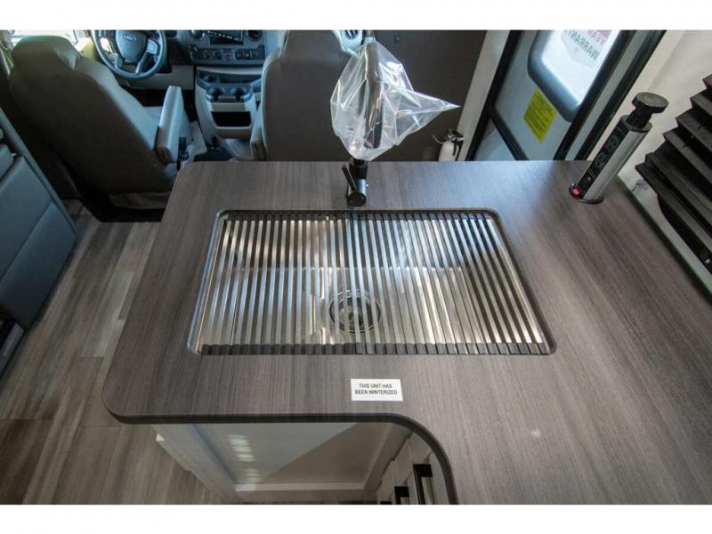 With any Odyssey Class C gas motorhome by Entegra Coach, the driver will appreciate the power from the 325 HP engine, the towing capacity from the 7,500 lb. hitch, the tire pressure monitoring system, the navigation from the Sony infotainment center with Apple CarPlay and Android Auto, plus the backup and side-view cameras when parking and driving down the highway. The kitchen offers full amenities including a recessed stainless steel sink with a cutting board sink cover, LED-lit pressed countertops, a decorative backsplash, and a pop-up charging station with 110 outlet and USB plugs to keep your smart phones charged. Get ready for luxury in a Class C, choose your favorite today!