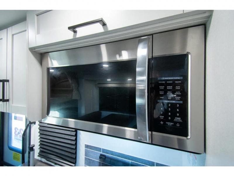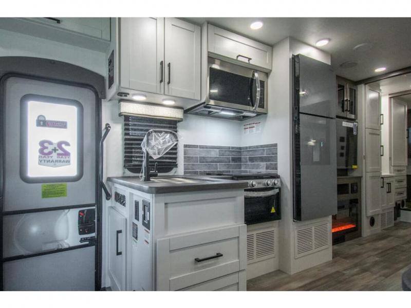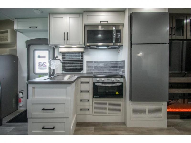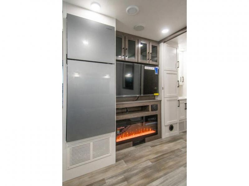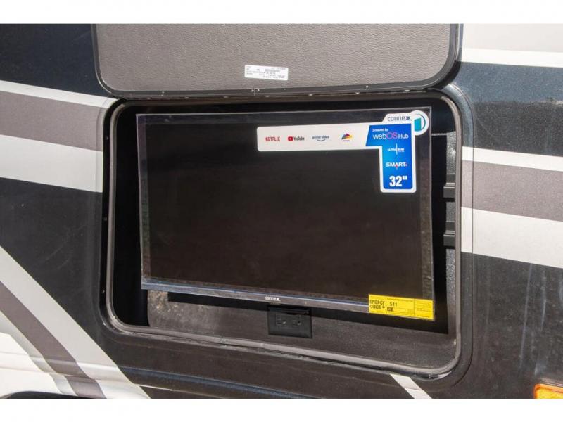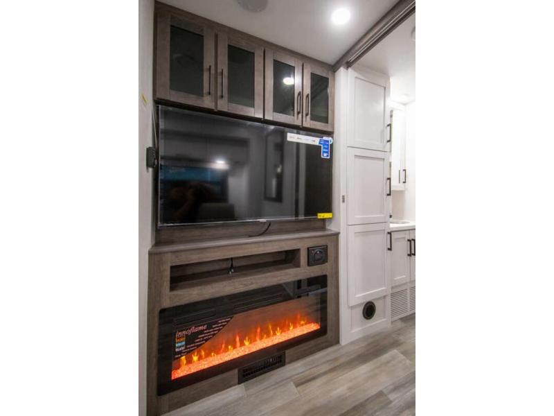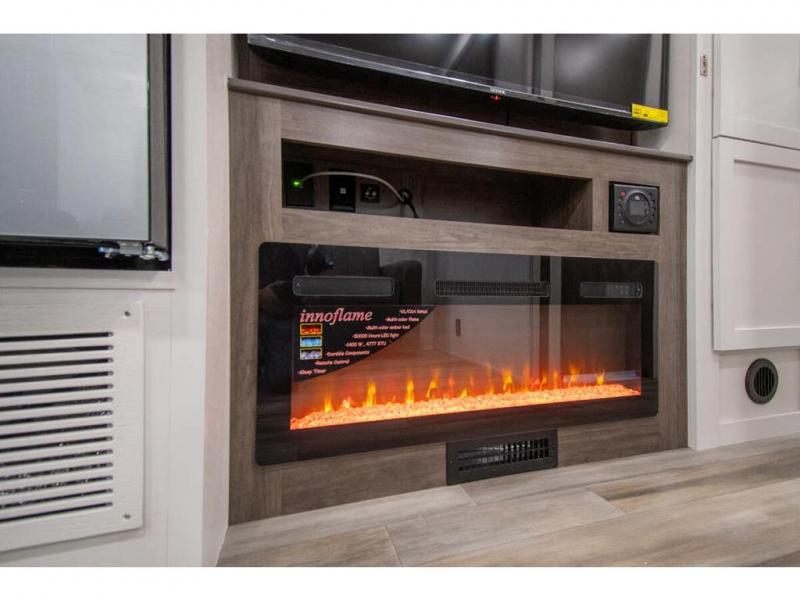 Relax inside while sitting on the sofa, at the booth dinette or on the swivel captains chairs while enjoying the fireplace and 50" TV, or unwind outside under the 18' electric awning while watching the exterior TV. After shopping in town or hiking the trails you can get cleaned up in the private toilet and shower room then brush your teeth in the bathroom sink a few steps outside the door. The private bedroom includes a space saving sliding door, a unique rear queen bed slide, plus storage. The cook will enjoy making meals using the residential-size microwave and Furrion all-in-one cooktop and oven, then storing leftovers in the 8 cu. ft. refrigerator. And the L-shaped counter with sink will come in handy.
