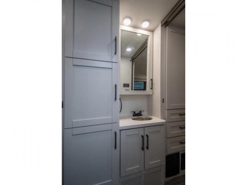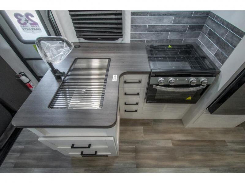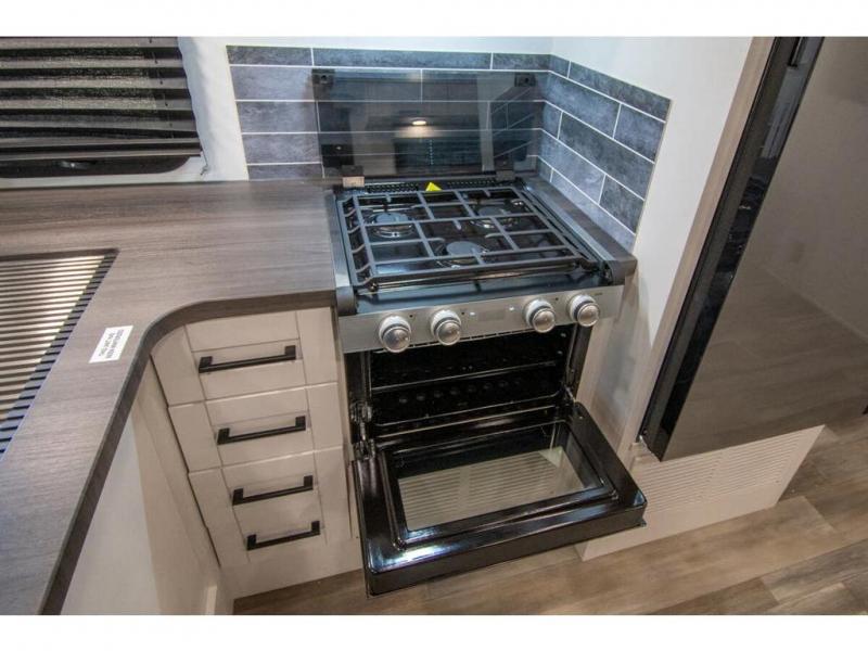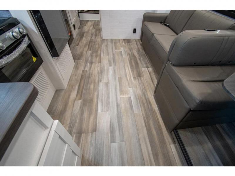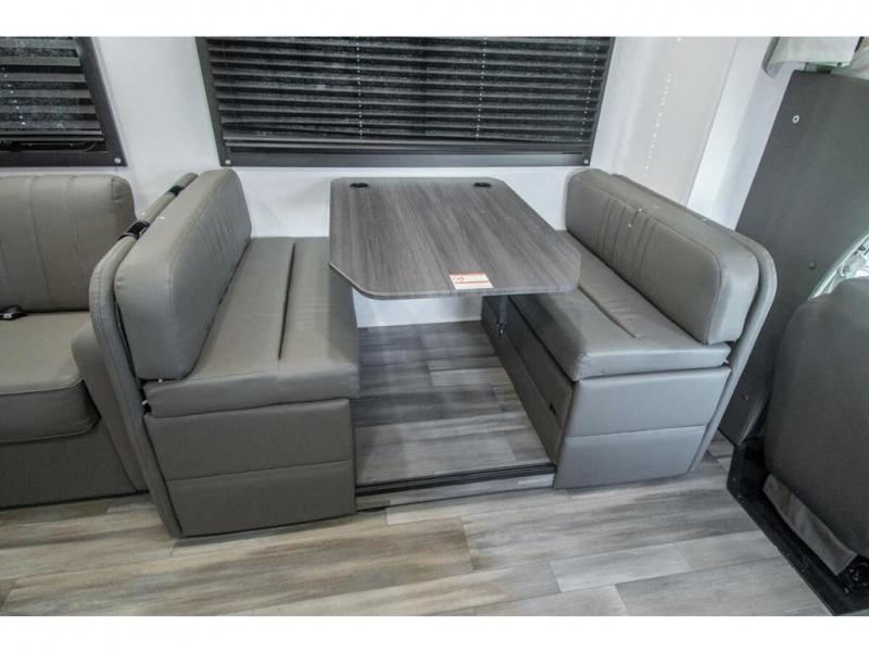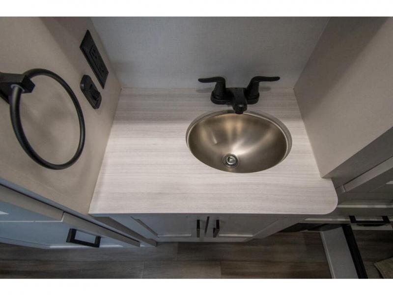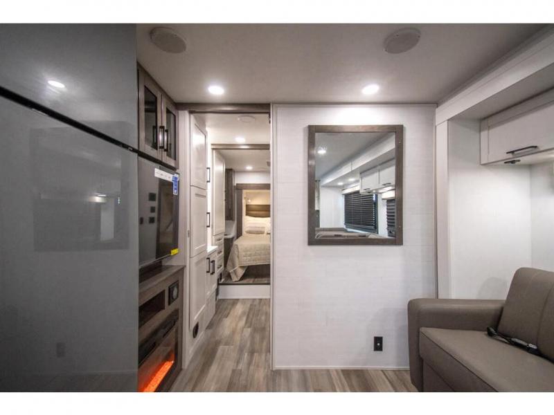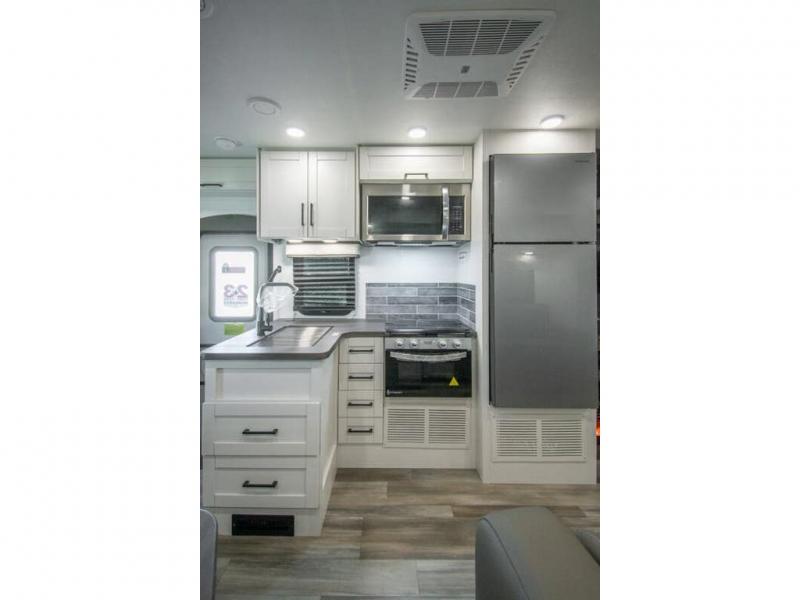 Relax inside while sitting on the sofa, at the booth dinette or on the swivel captains chairs while enjoying the fireplace and 50" TV, or unwind outside under the 18' electric awning while watching the exterior TV. After shopping in town or hiking the trails you can get cleaned up in the private toilet and shower room then brush your teeth in the bathroom sink a few steps outside the door. The private bedroom includes a space saving sliding door, a unique rear queen bed slide, plus storage. The cook will enjoy making meals using the residential-size microwave and Furrion all-in-one cooktop and oven, then storing leftovers in the 8 cu. ft. refrigerator. And the L-shaped counter with sink will come in handy.