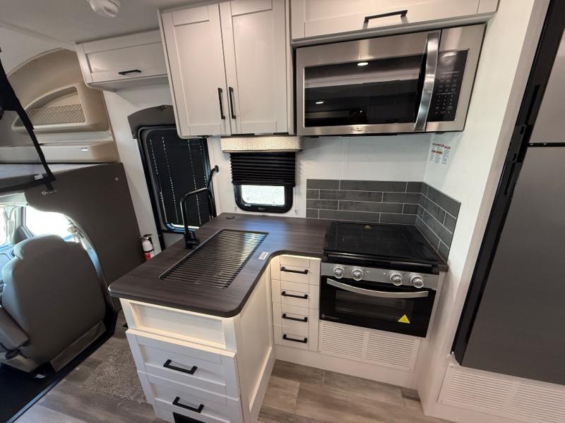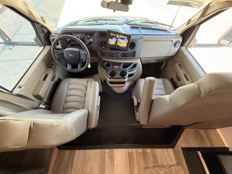 With any Odyssey Class C gas motorhome by Entegra Coach, the driver will appreciate the power from the 325 HP engine, the towing capacity from the 7,500 lb. hitch, the tire pressure monitoring system, the navigation from the Sony infotainment center with Apple CarPlay and Android Auto, plus the backup and side-view cameras when parking and driving down the highway. The kitchen offers full amenities including a recessed stainless steel sink with a cutting board sink cover, LED-lit pressed countertops, a decorative backsplash, and a pop-up charging station with 110 outlet and USB plugs to keep your smart phones charged. Get ready for luxury in a Class C, choose your favorite today!