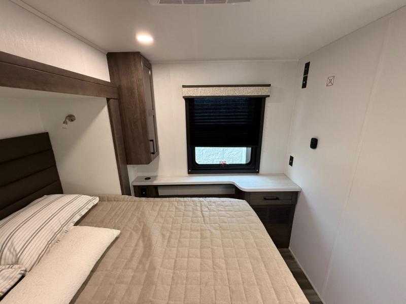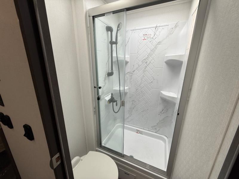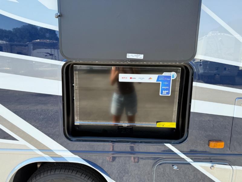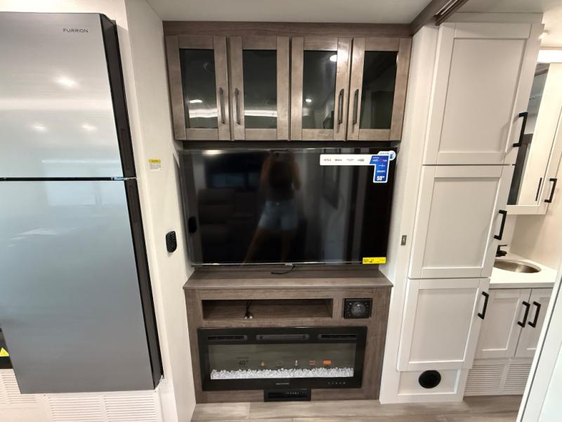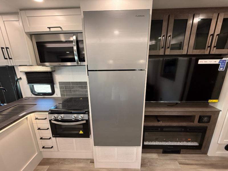 Relax inside while sitting on the sofa, at the booth dinette or on the swivel captains chairs while enjoying the fireplace and 50" TV, or unwind outside under the 18' electric awning while watching the exterior TV. After shopping in town or hiking the trails you can get cleaned up in the private toilet and shower room then brush your teeth in the bathroom sink a few steps outside the door. The private bedroom includes a space saving sliding door, a unique rear queen bed slide, plus storage. The cook will enjoy making meals using the residential-size microwave and Furrion all-in-one cooktop and oven, then storing leftovers in the 8 cu. ft. refrigerator. And the L-shaped counter with sink will come in handy.