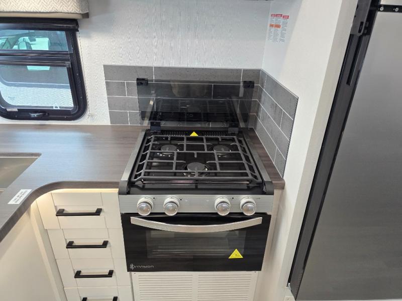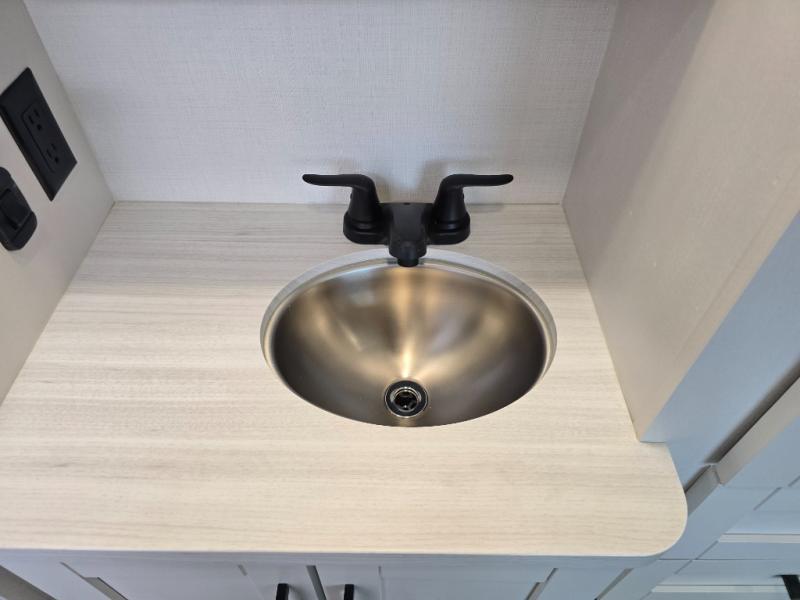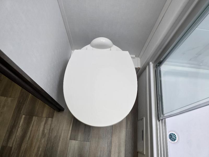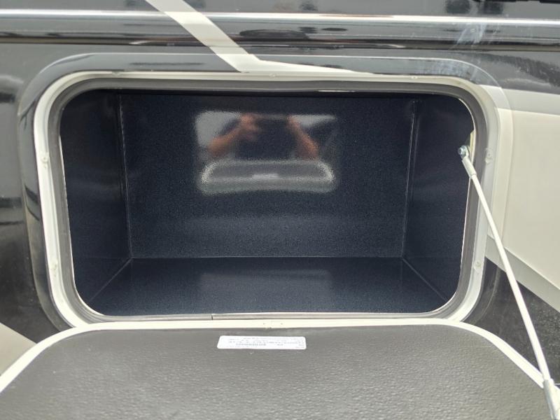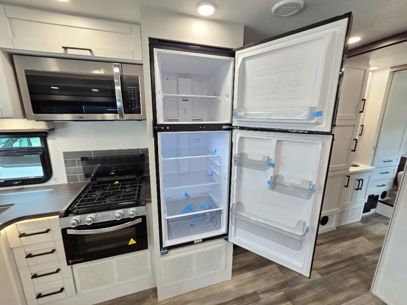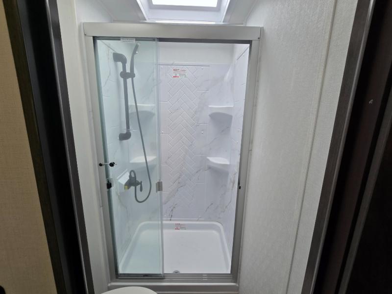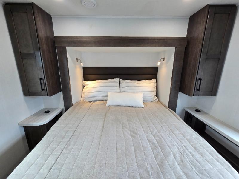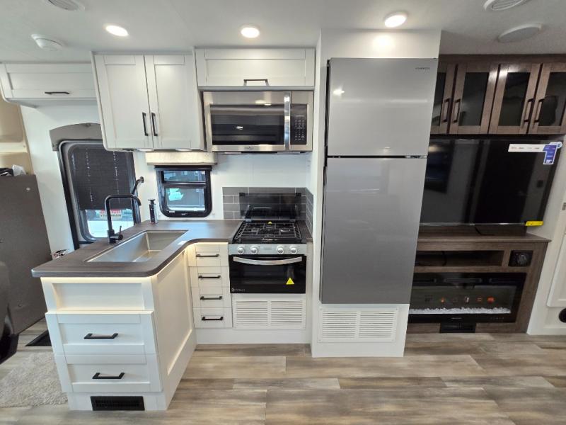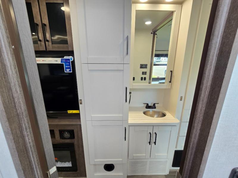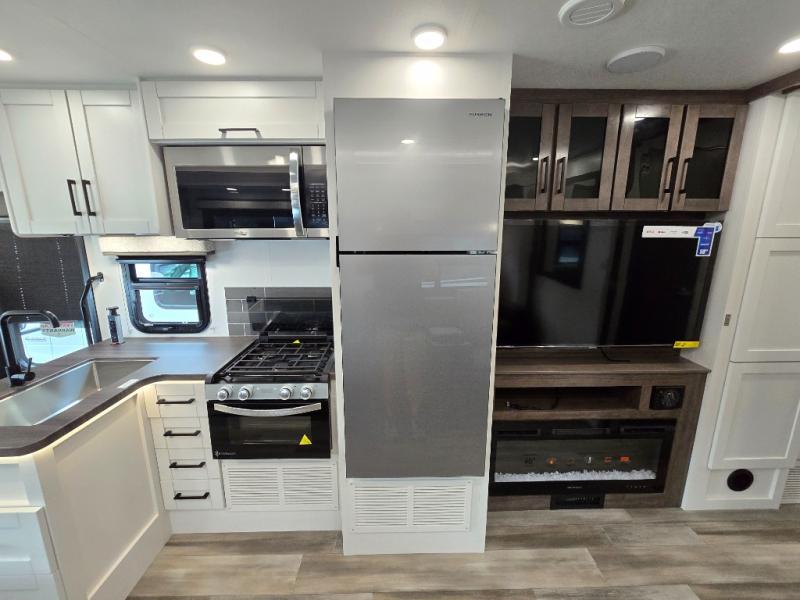 Relax inside while sitting on the sofa, at the booth dinette or on the swivel captains chairs while enjoying the fireplace and 50" TV, or unwind outside under the 18' electric awning while watching the exterior TV. After shopping in town or hiking the trails you can get cleaned up in the private toilet and shower room then brush your teeth in the bathroom sink a few steps outside the door. The private bedroom includes a space saving sliding door, a unique rear queen bed slide, plus storage. The cook will enjoy making meals using the residential-size microwave and Furrion all-in-one cooktop and oven, then storing leftovers in the 8 cu. ft. refrigerator. And the L-shaped counter with sink will come in handy.