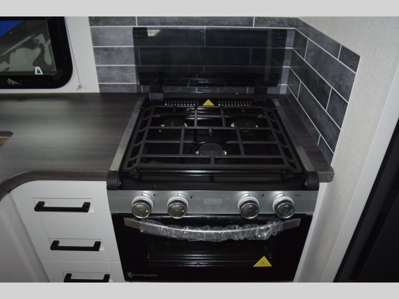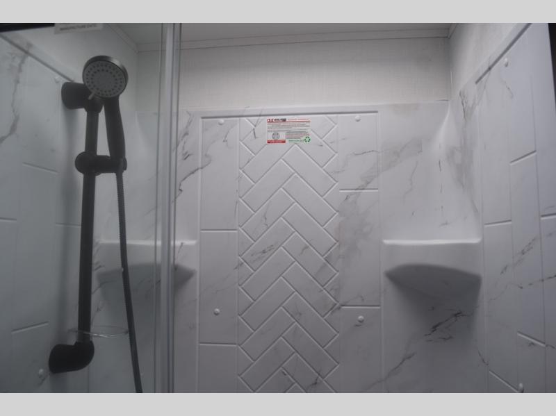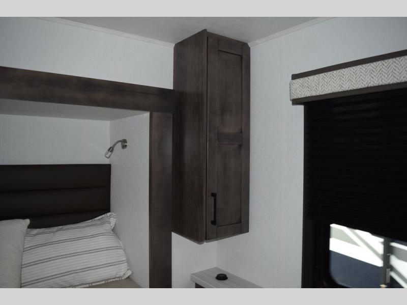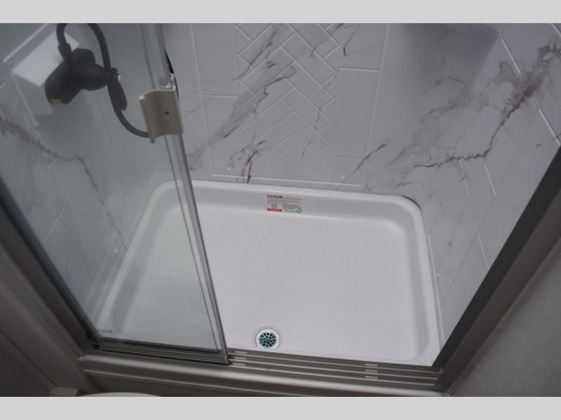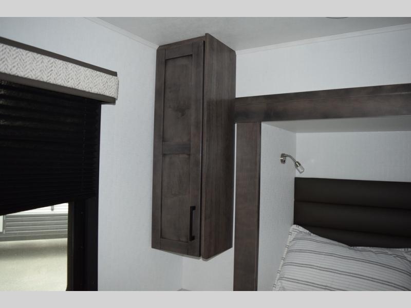 Relax inside while sitting on the sofa, at the booth dinette or on the swivel captains chairs while enjoying the fireplace and 50" TV, or unwind outside under the 18' electric awning while watching the exterior TV. After shopping in town or hiking the trails you can get cleaned up in the private toilet and shower room then brush your teeth in the bathroom sink a few steps outside the door. The private bedroom includes a space saving sliding door, a unique rear queen bed slide, plus storage. The cook will enjoy making meals using the residential-size microwave and Furrion all-in-one cooktop and oven, then storing leftovers in the 8 cu. ft. refrigerator. And the L-shaped counter with sink will come in handy.