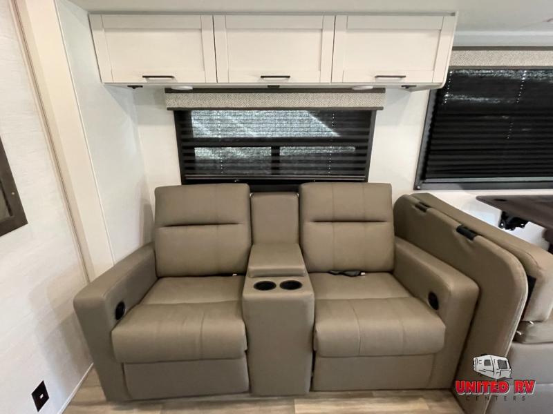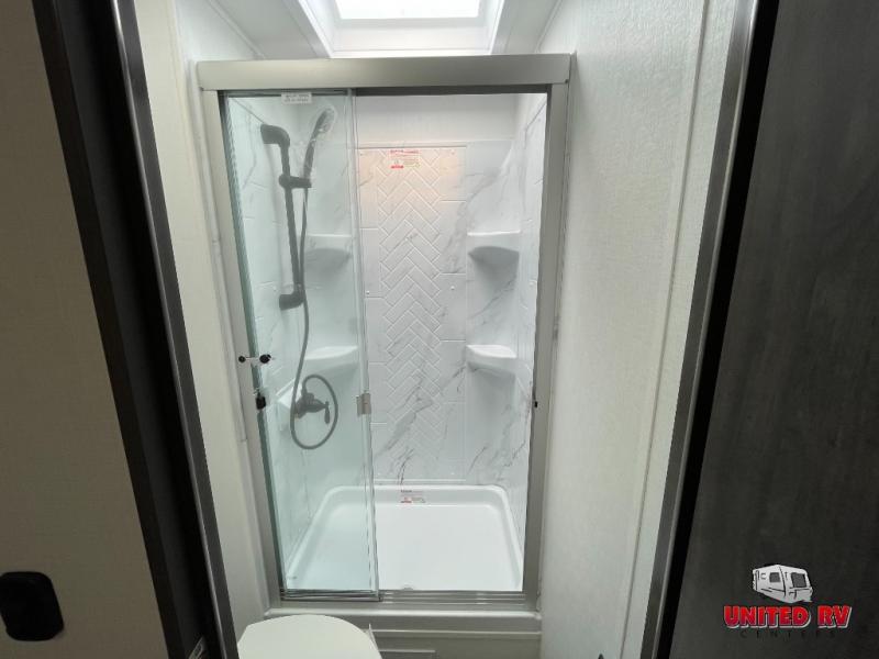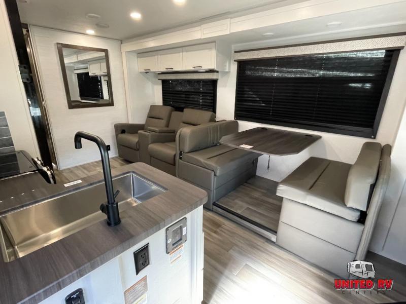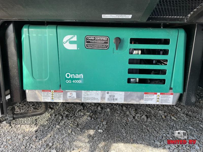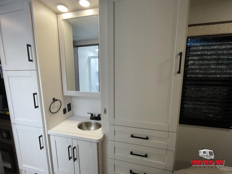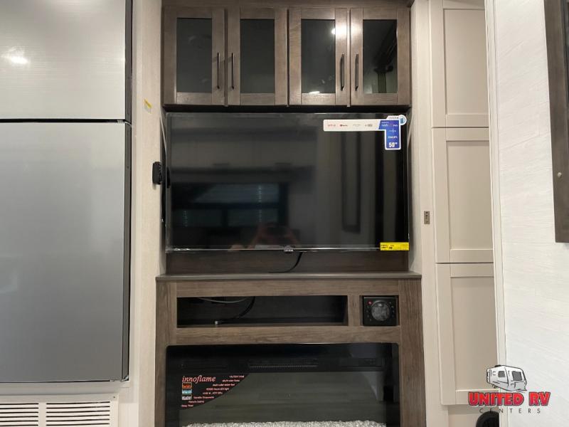 Relax inside while sitting on the sofa, at the booth dinette or on the swivel captains chairs while enjoying the fireplace and 50" TV, or unwind outside under the 18' electric awning while watching the exterior TV. After shopping in town or hiking the trails you can get cleaned up in the private toilet and shower room then brush your teeth in the bathroom sink a few steps outside the door. The private bedroom includes a space saving sliding door, a unique rear queen bed slide, plus storage. The cook will enjoy making meals using the residential-size microwave and Furrion all-in-one cooktop and oven, then storing leftovers in the 8 cu. ft. refrigerator. And the L-shaped counter with sink will come in handy.