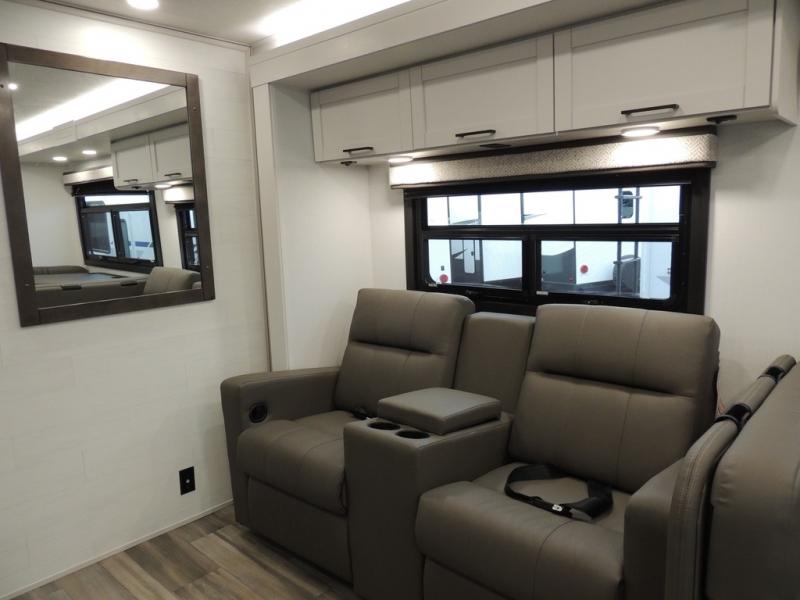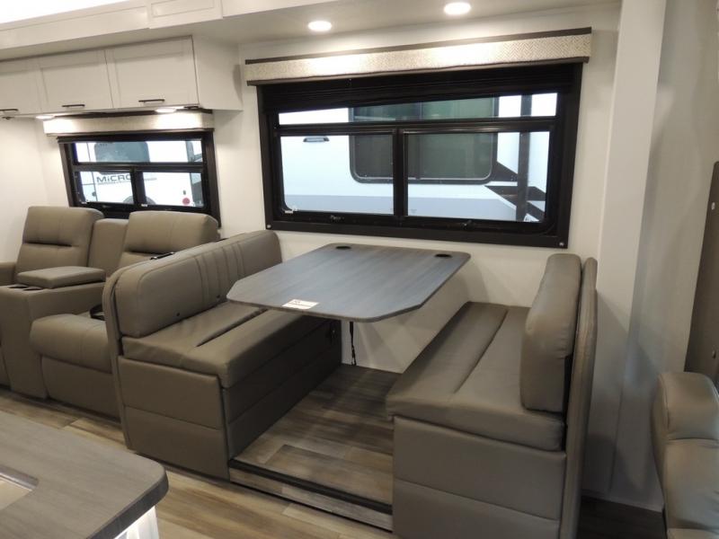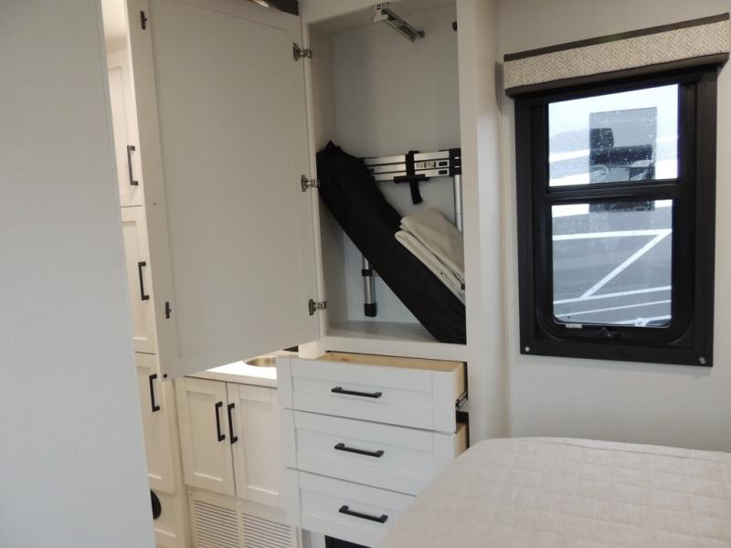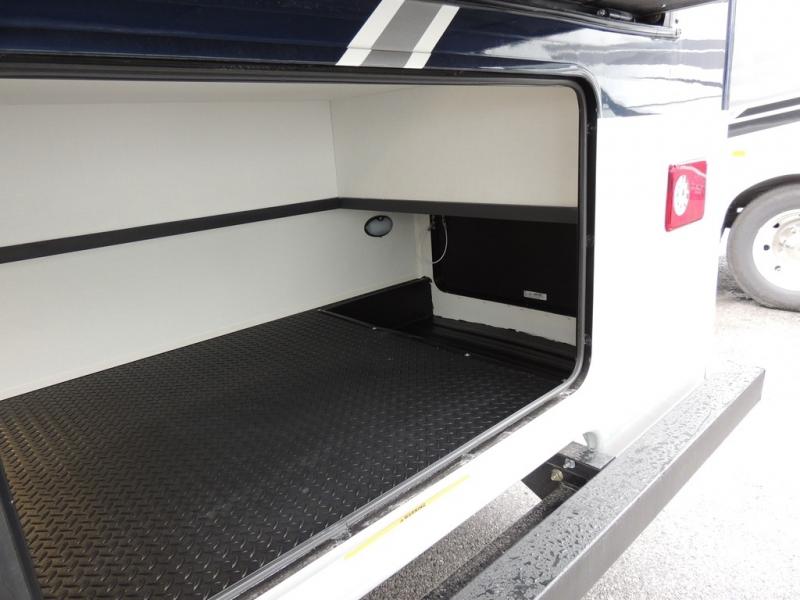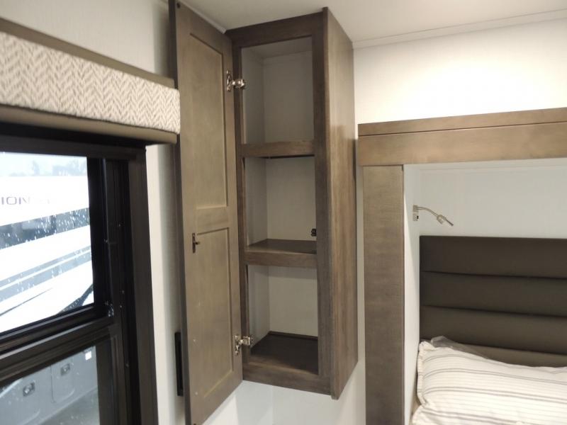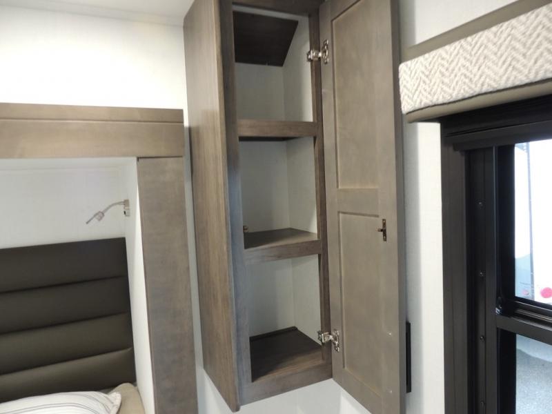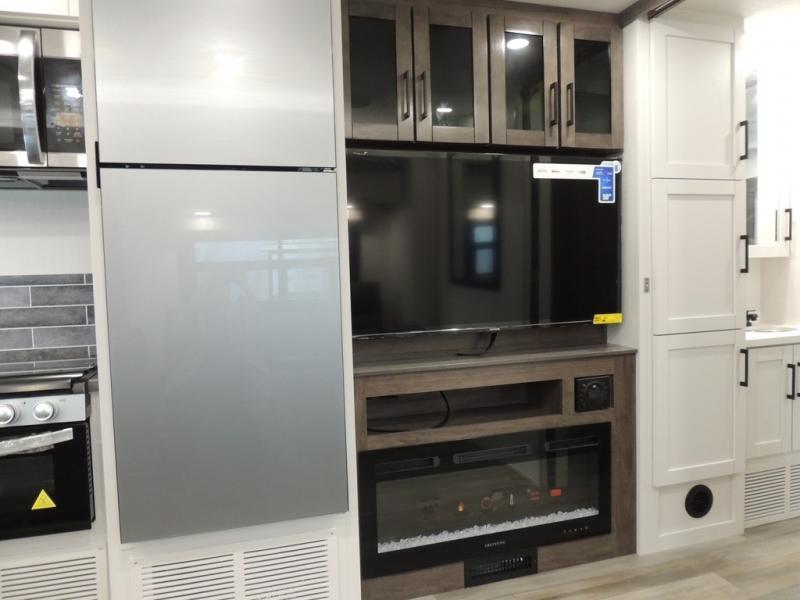Relax inside while sitting on the sofa, at the booth dinette or on the swivel captains chairs while enjoying the fireplace and 50" TV, or unwind outside under the 18' electric awning while watching the exterior TV. After shopping in town or hiking the trails you can get cleaned up in the private toilet and shower room then brush your teeth in the bathroom sink a few steps outside the door. The private bedroom includes a space saving sliding door, a unique rear queen bed slide, plus storage. The cook will enjoy making meals using the residential-size microwave and Furrion all-in-one cooktop and oven, then storing leftovers in the 8 cu. ft. refrigerator. And the L-shaped counter with sink will come in handy.