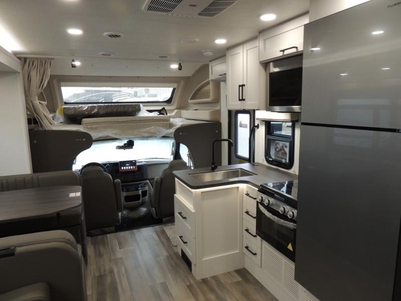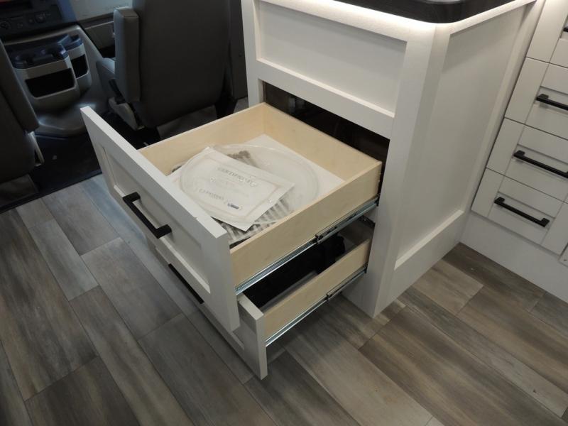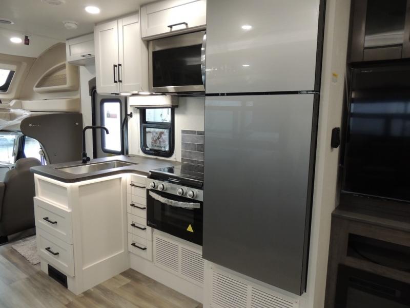 With any Odyssey Class C gas motorhome by Entegra Coach, the driver will appreciate the power from the 325 HP engine, the towing capacity from the 7,500 lb. hitch, the tire pressure monitoring system, the navigation from the Sony infotainment center with Apple CarPlay and Android Auto, plus the backup and side-view cameras when parking and driving down the highway. The kitchen offers full amenities including a recessed stainless steel sink with a cutting board sink cover, LED-lit pressed countertops, a decorative backsplash, and a pop-up charging station with 110 outlet and USB plugs to keep your smart phones charged. Get ready for luxury in a Class C, choose your favorite today!