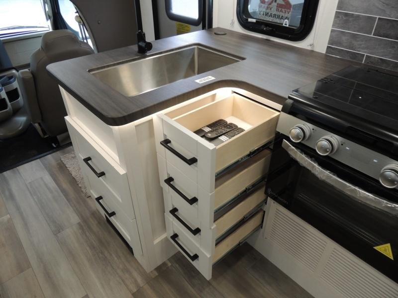 With any Odyssey Class C gas motorhome by Entegra Coach, the driver will appreciate the power from the 325 HP engine, the towing capacity from the 7,500 lb. hitch, the tire pressure monitoring system, the navigation from the Sony infotainment center with Apple CarPlay and Android Auto, plus the backup and side-view cameras when parking and driving down the highway. The kitchen offers full amenities including a recessed stainless steel sink with a cutting board sink cover, LED-lit pressed countertops, a decorative backsplash, and a pop-up charging station with 110 outlet and USB plugs to keep your smart phones charged. Get ready for luxury in a Class C, choose your favorite today!
